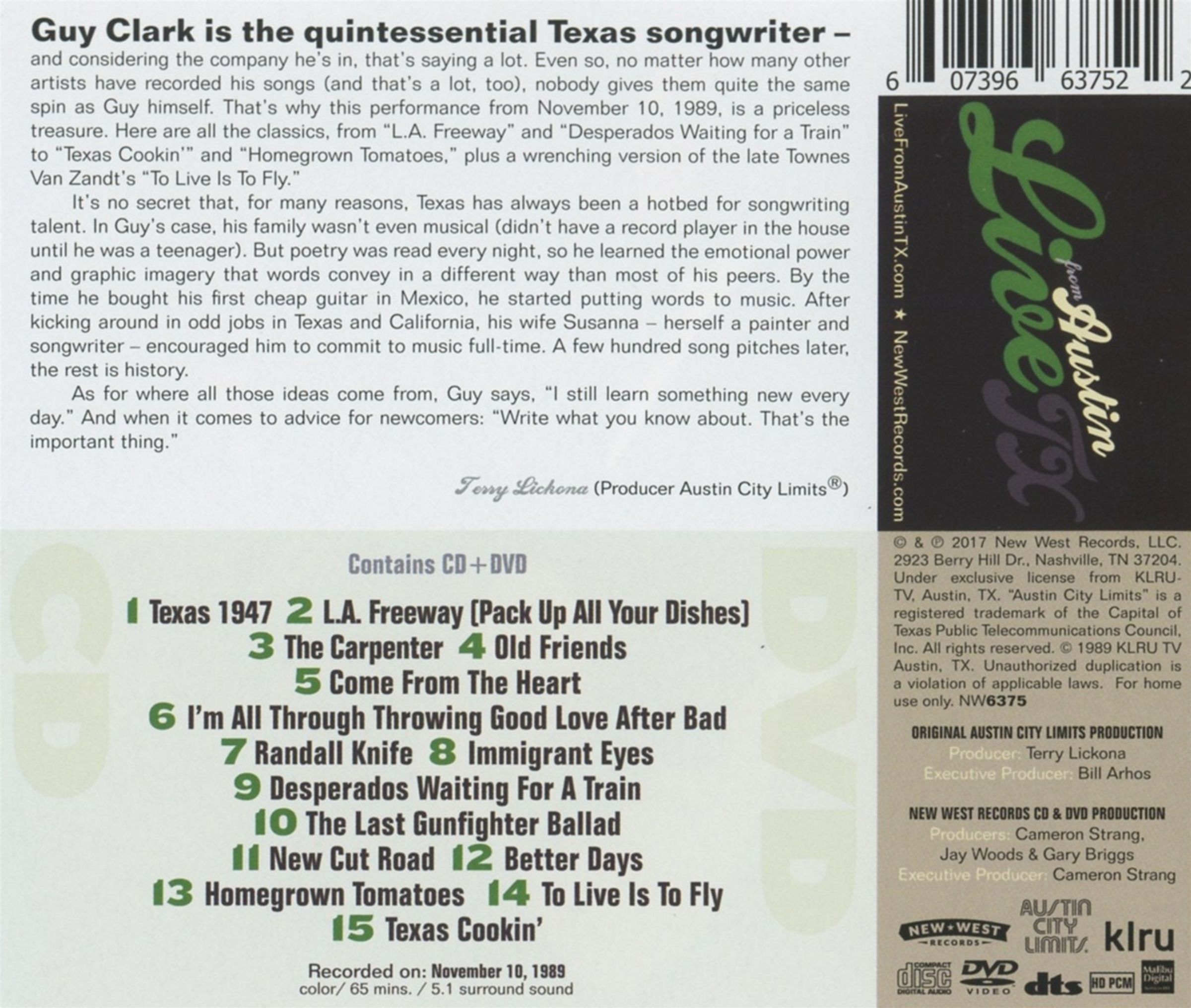 Steve Earle war sein Mentor, erst 2014 gewann er den Grammy für das beste Folk-Album. Der Texaner Guy Clark bewegt sich seit Jahrzehnten musikalisch zwischen Folk und Country, gilt bei seinen Fans als "a king of the Texas troubadours". Ein Konzert in Austin ist für Guy Clark ein Heimspiel, entsprechend präsentiert er sich bei dieser Aufnahme von 1989 in Höchstform. Die DVD dieses Sets hat keine Altersbeschränkung. Mit Hits wie "Texas Cookin'" und "LA Freeway" sind einige der Hochkaräter aus seinem Repertoire enthalten. Da dieses Konzert von vorne herein für die TV-Ausstrahlung konzipiert war, wählte Clark die Stücke so, dass die Bandbreite seines Schaffens berücksichtigt ist.