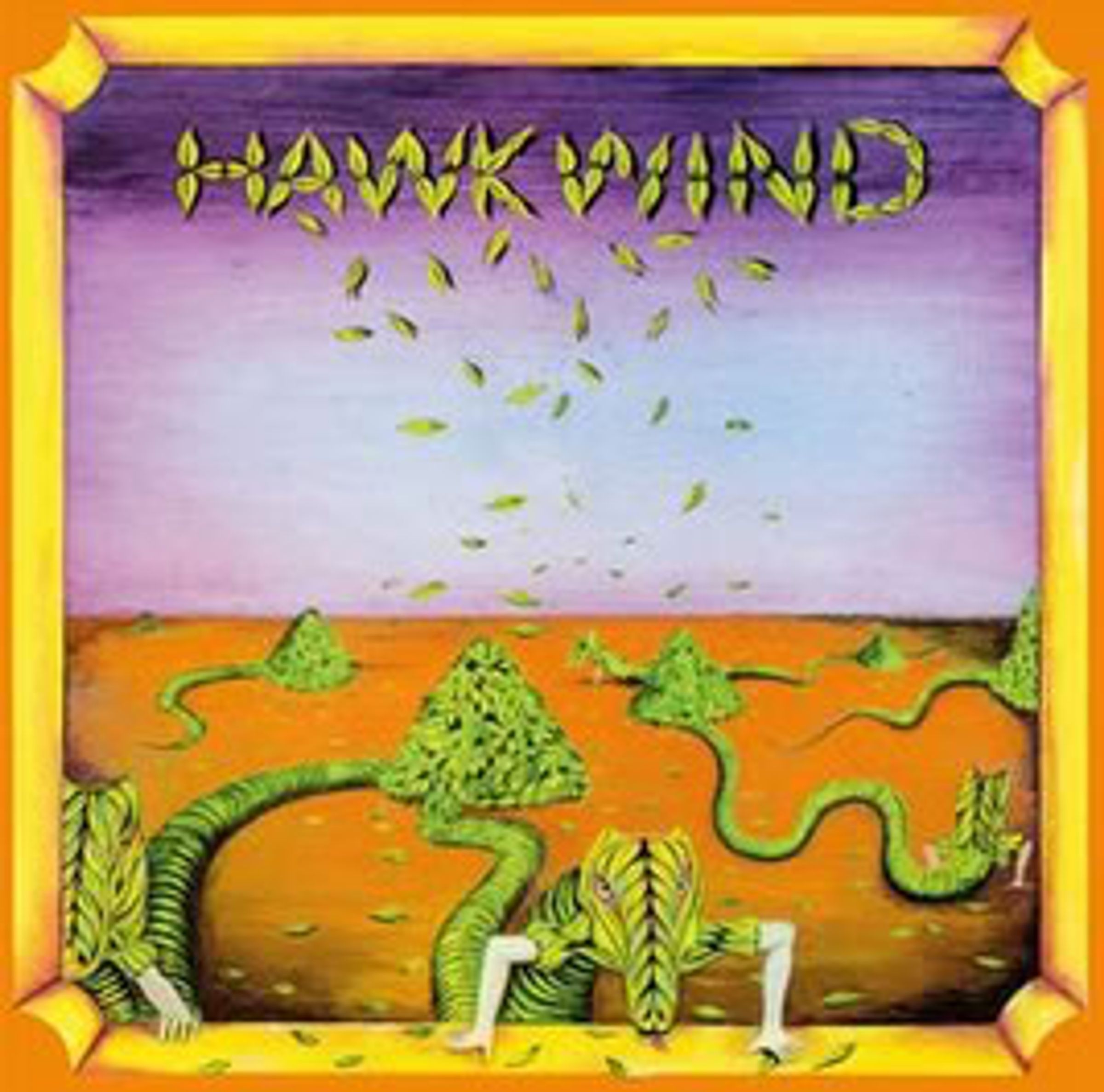 Text: „HAWKWIND“. Illustration: Bunte Szene mit blättrigen Figuren, Pyramiden und einem lila Himmel., CD