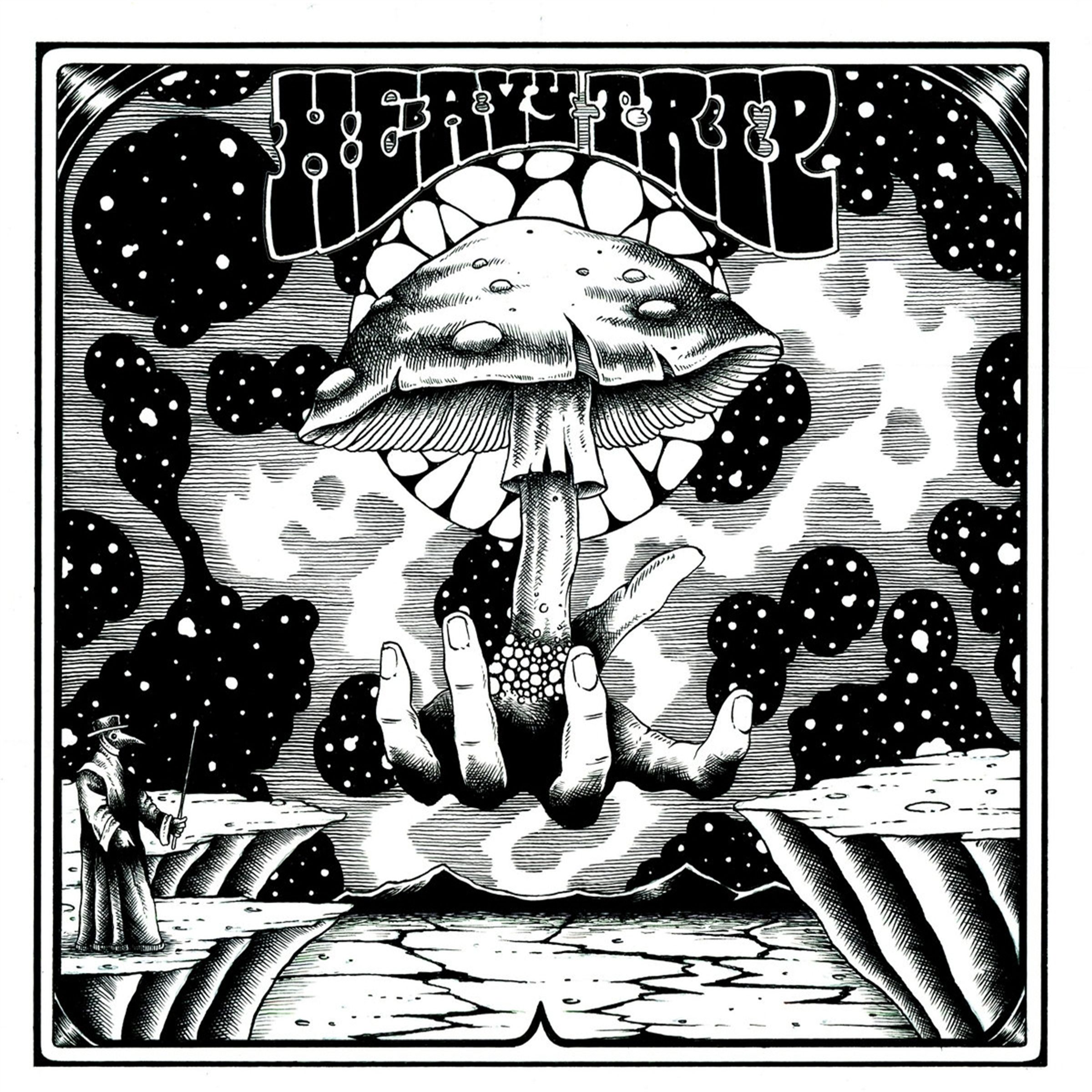 Text: „HEAVY TRIP“. Illustration: Riesige Hand hält Pilz, surrealer Hintergrund mit mystischem Motiv, Szenen mit Zauberer am Abgrund., CD