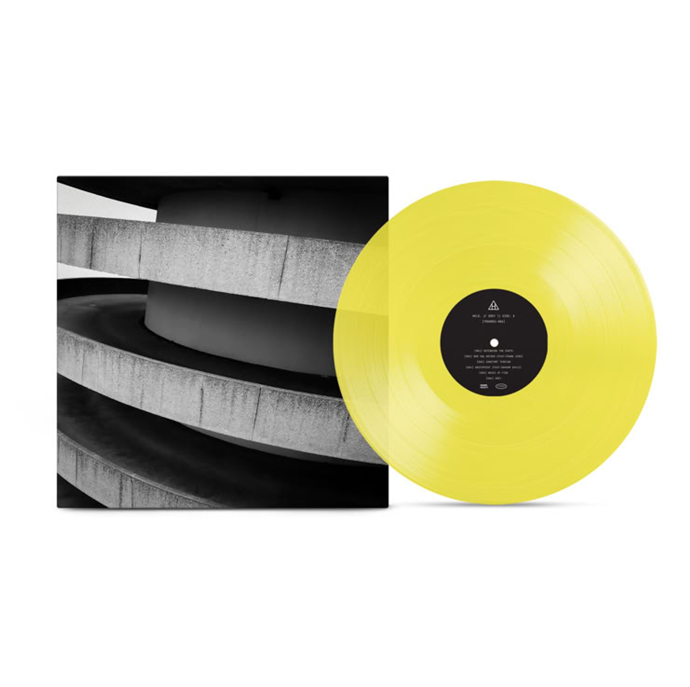 Schwarze Scheibe mit Text, gelbe Schallplatte. Graues Betongebäude mit Rundungen auf dem Cover., LP