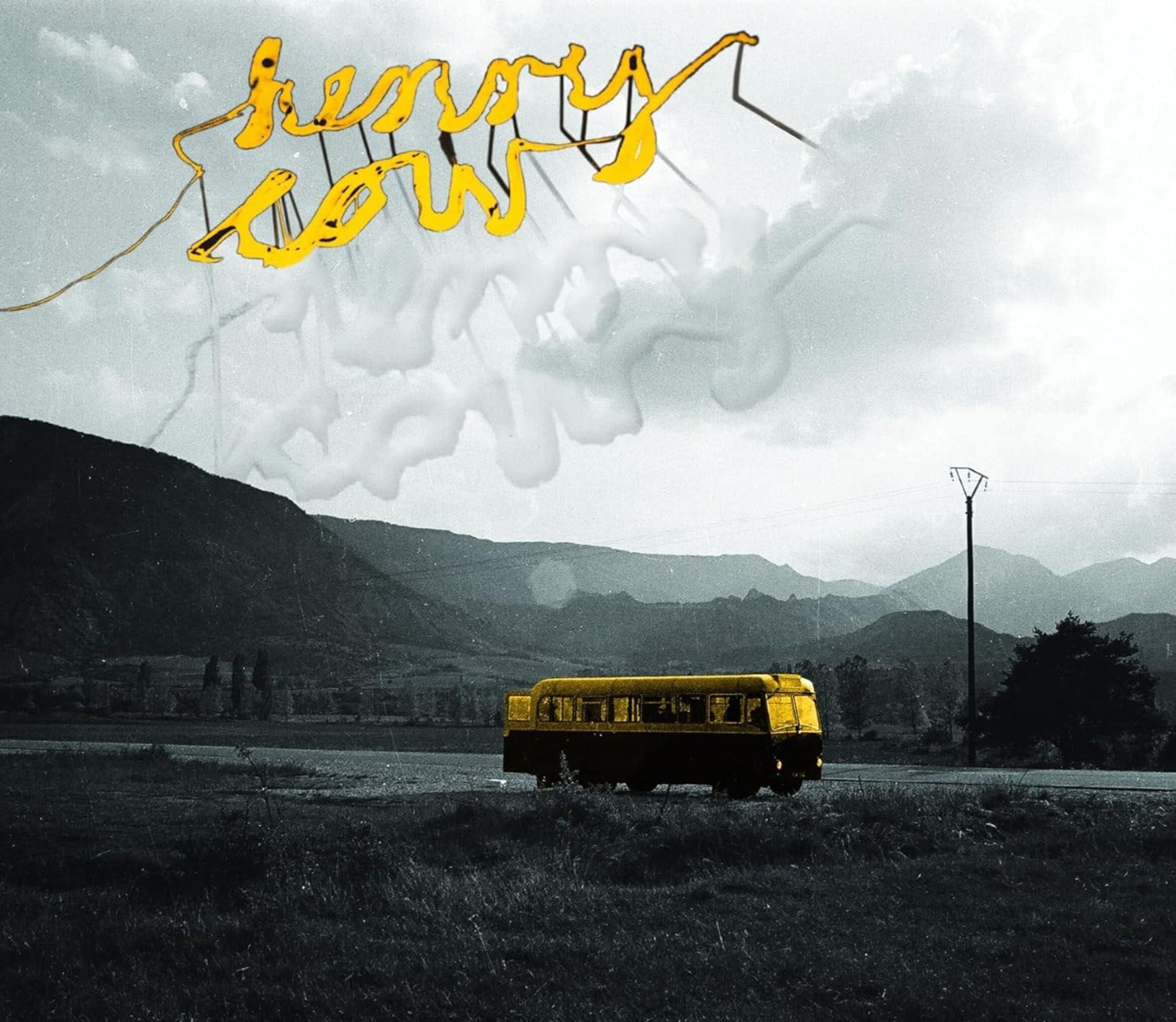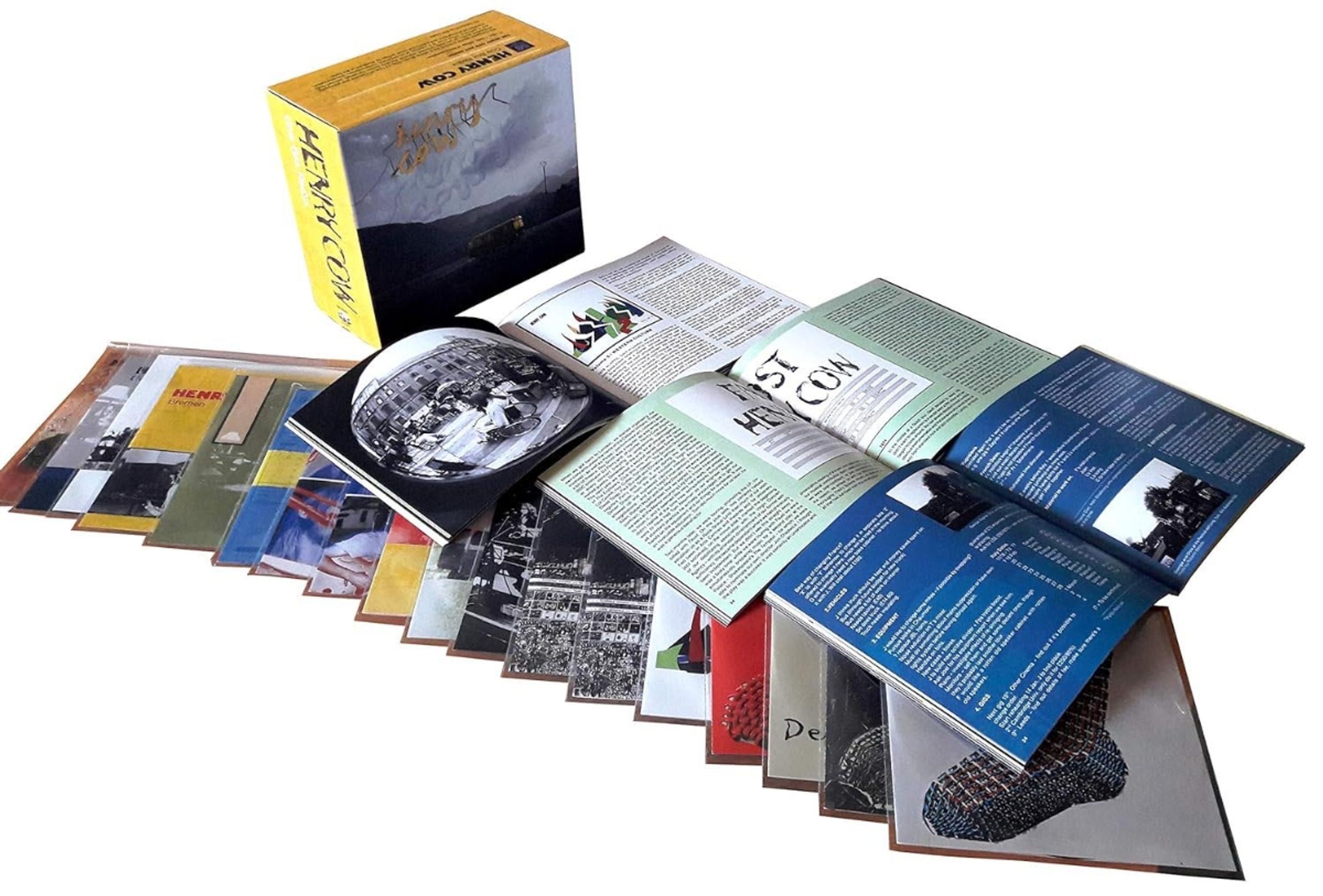 Gelber Schriftzug "Henry Cow", gelber Bus auf ländlicher Straße, Berge im Hintergrund, schwarz-weiße Landschaft., 17 CDs und 1 DVD