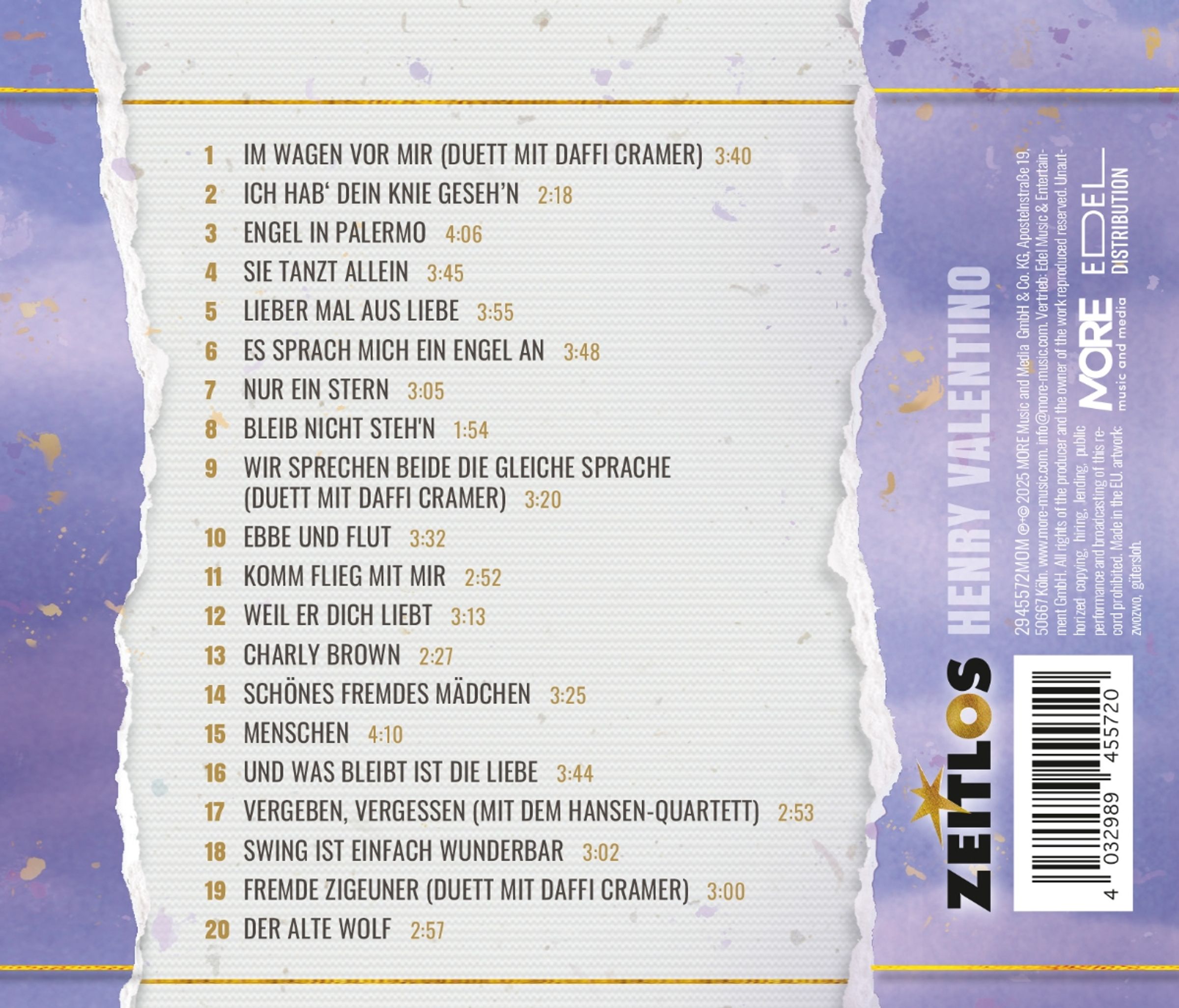 Dieser Ära widmet sich nun die neueste Ausgabe von »Zeitlos«, natürlich mit seinem größten Erfolg »Im Wagen vor mir«. Mit seiner unverkennbaren Reibeisenstimme und im Duett mit Gesangspartnerin Uschi (später Daffi Cramer) platzierte sich Valentino mit dem Hit 33 Wochen in den deutschen Charts und trat mehrfach in der ZDF Hitparade auf. Der Song mit dem einprägsamen Refrain wurde vielfach gecovert und entwickelte sich zum absoluten Kultschlager. »Zeitlos – Henry Valentino« präsentiert die schönsten Schlager eines wahren Ausnahmekünstlers!