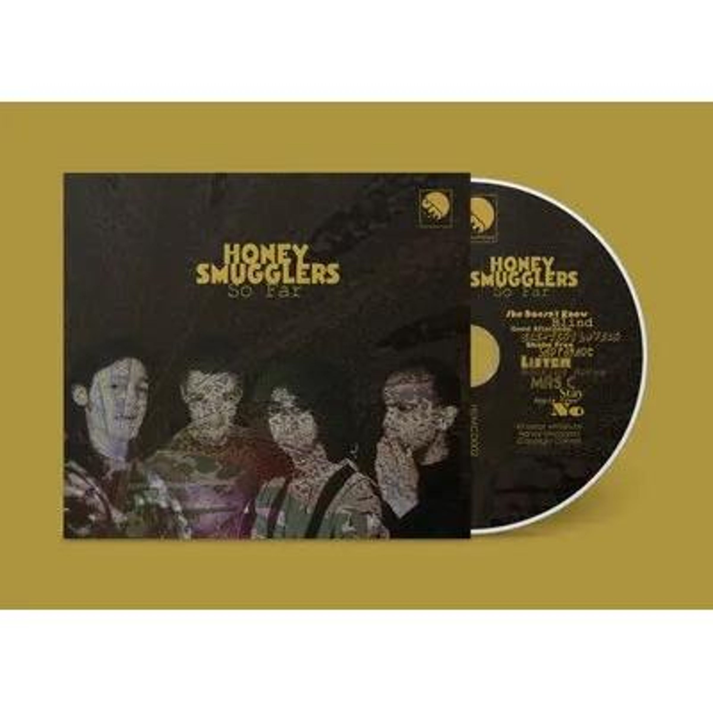 "Honey Smugglers, So Far". CD-Cover mit vier Menschen und schwarzer CD auf olivgrünem Hintergrund., CD