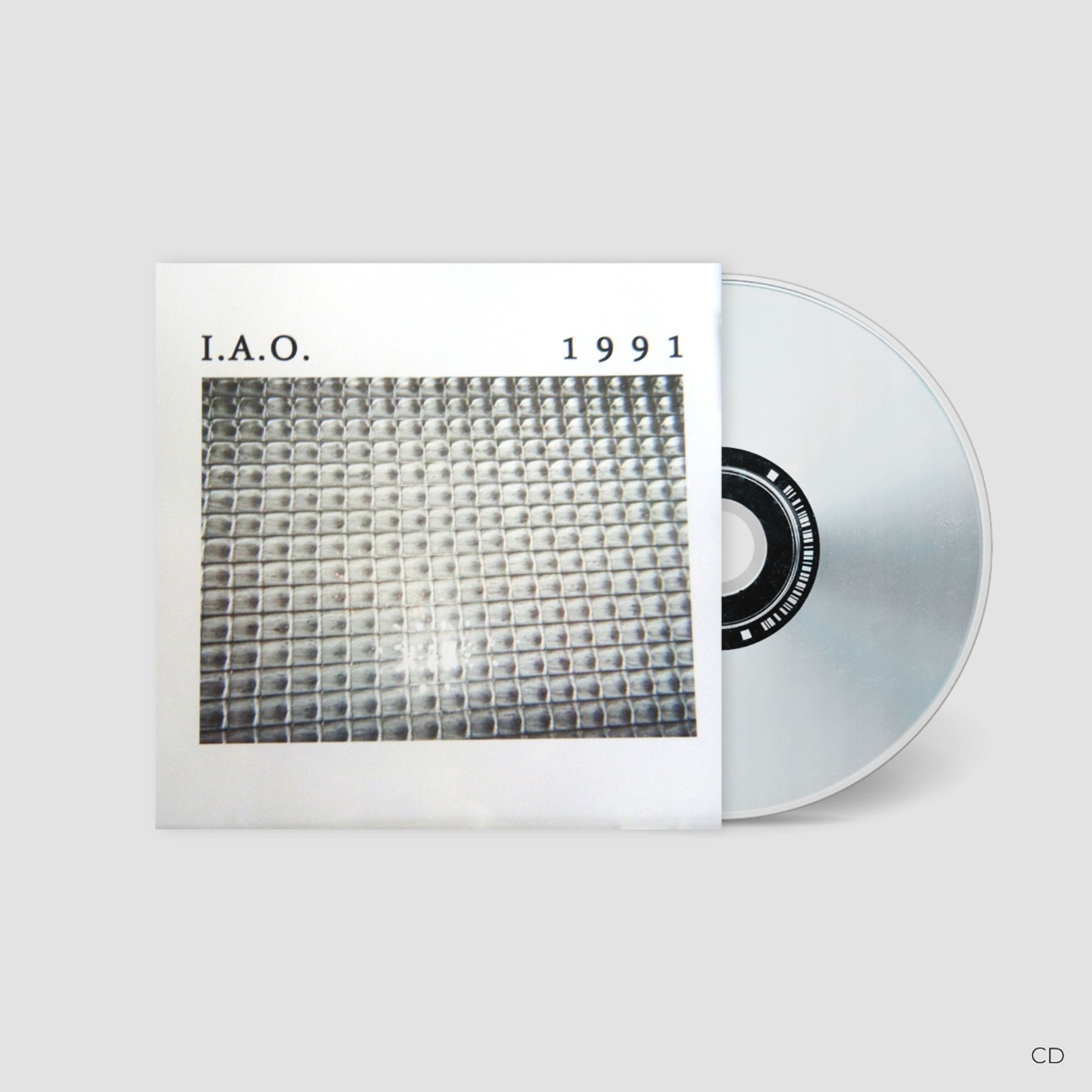 Text: „I.A.O. 1991“. Darstellung einer Oberfläche aus wiederholten, rechteckigen, metallischen Mustern., CD