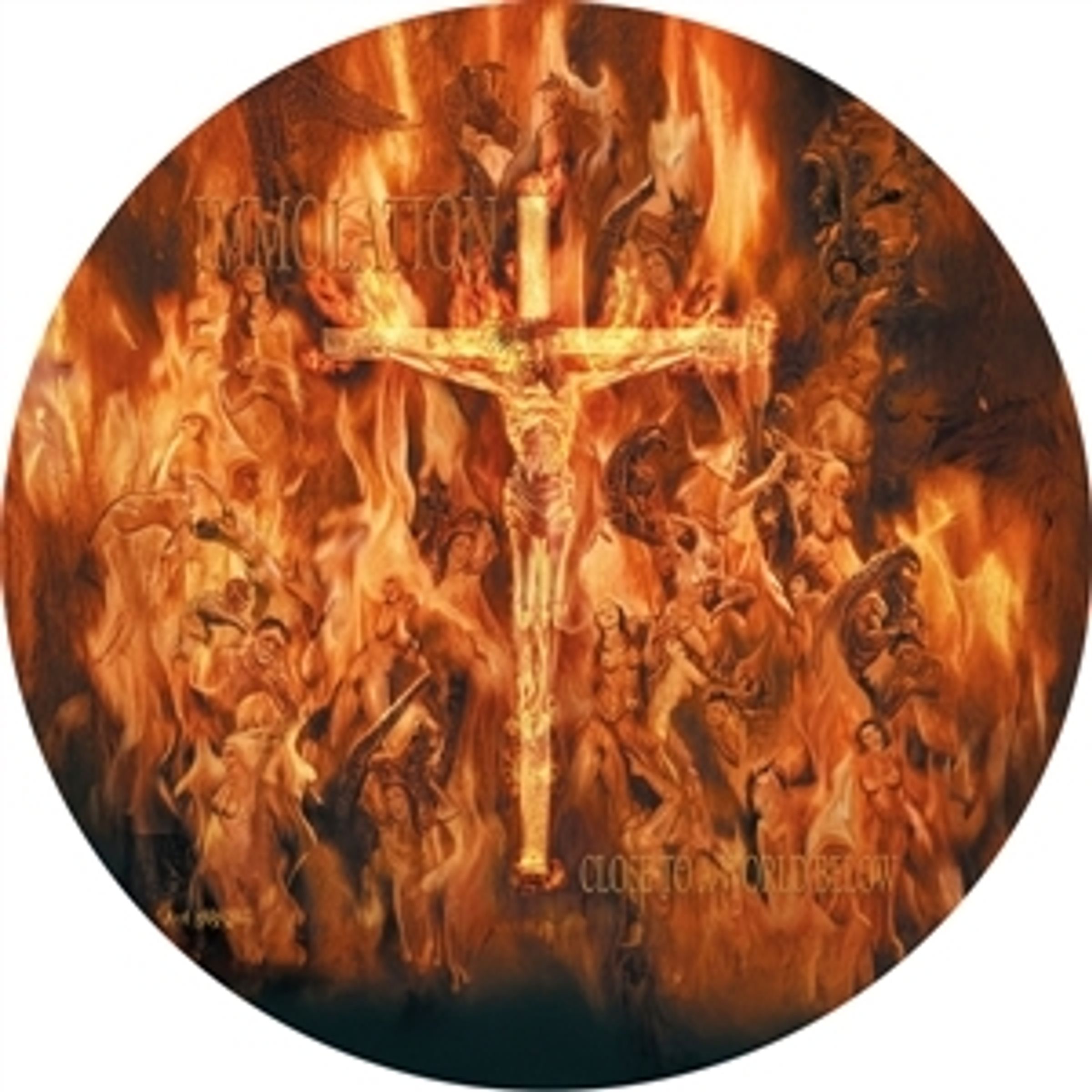 "IMMOLATION" und "CLOSE TO A WORLD BELOW" in Flammen, mit einem von feurigen Figuren umgebenen Kreuz., LP