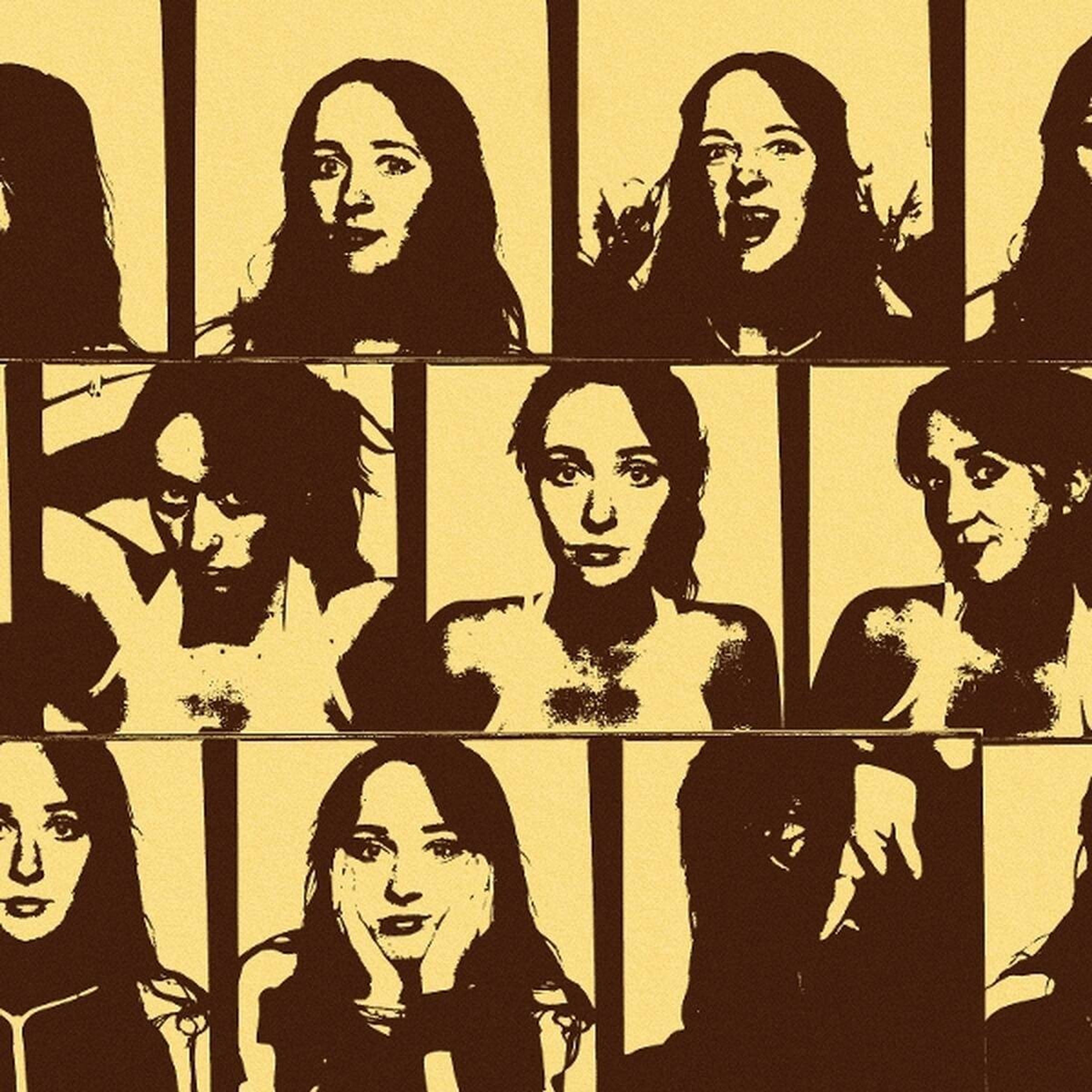 Mehrere Porträtillustrationen einer Frau in verschiedenen Posen, sepiafarben auf beigem Hintergrund., LP