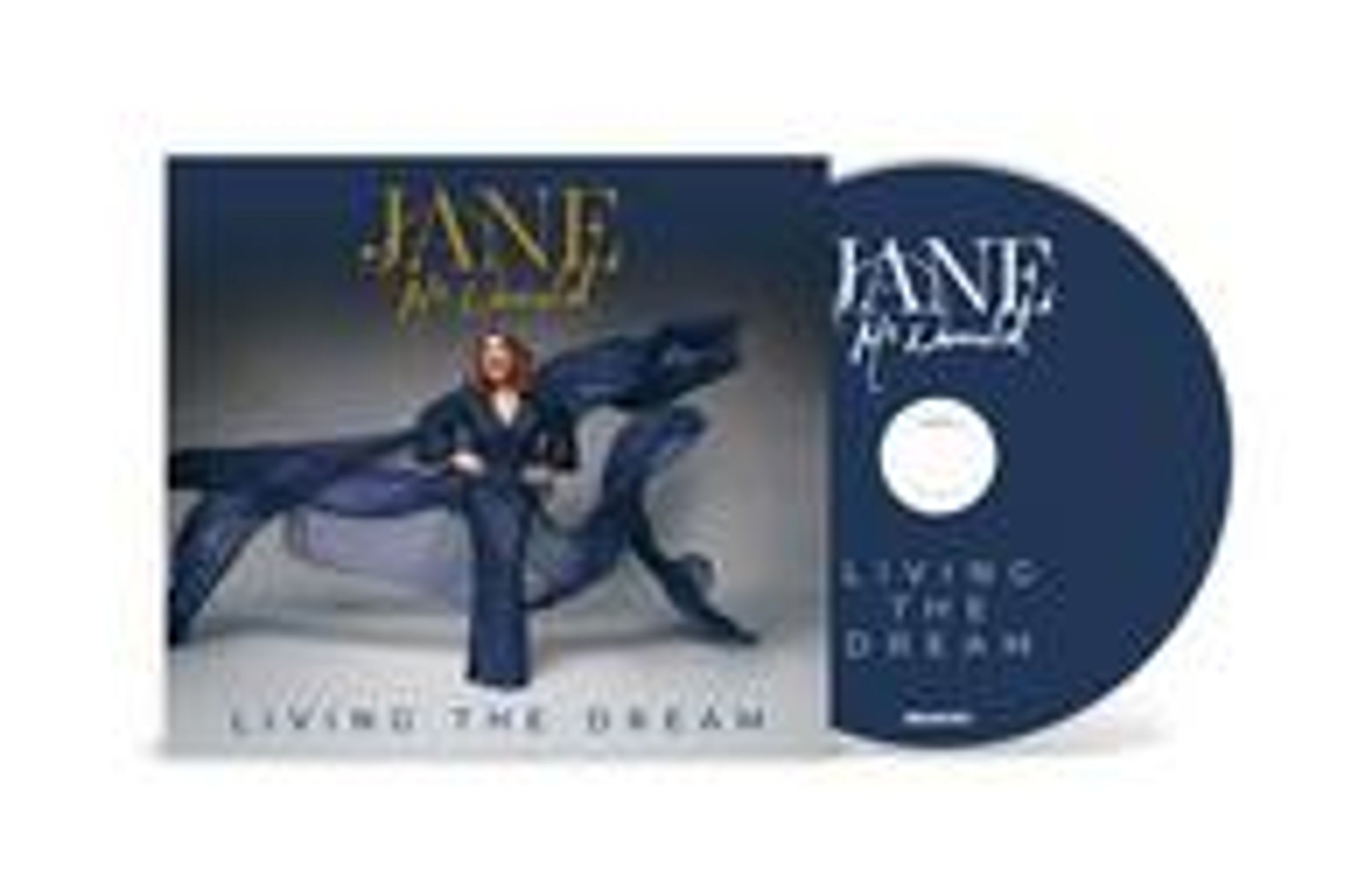 Text: "JANE McDonald" und "LIVING THE DREAM." Frau in blauem Kleid mit fließendem Stoff, posierend., CD