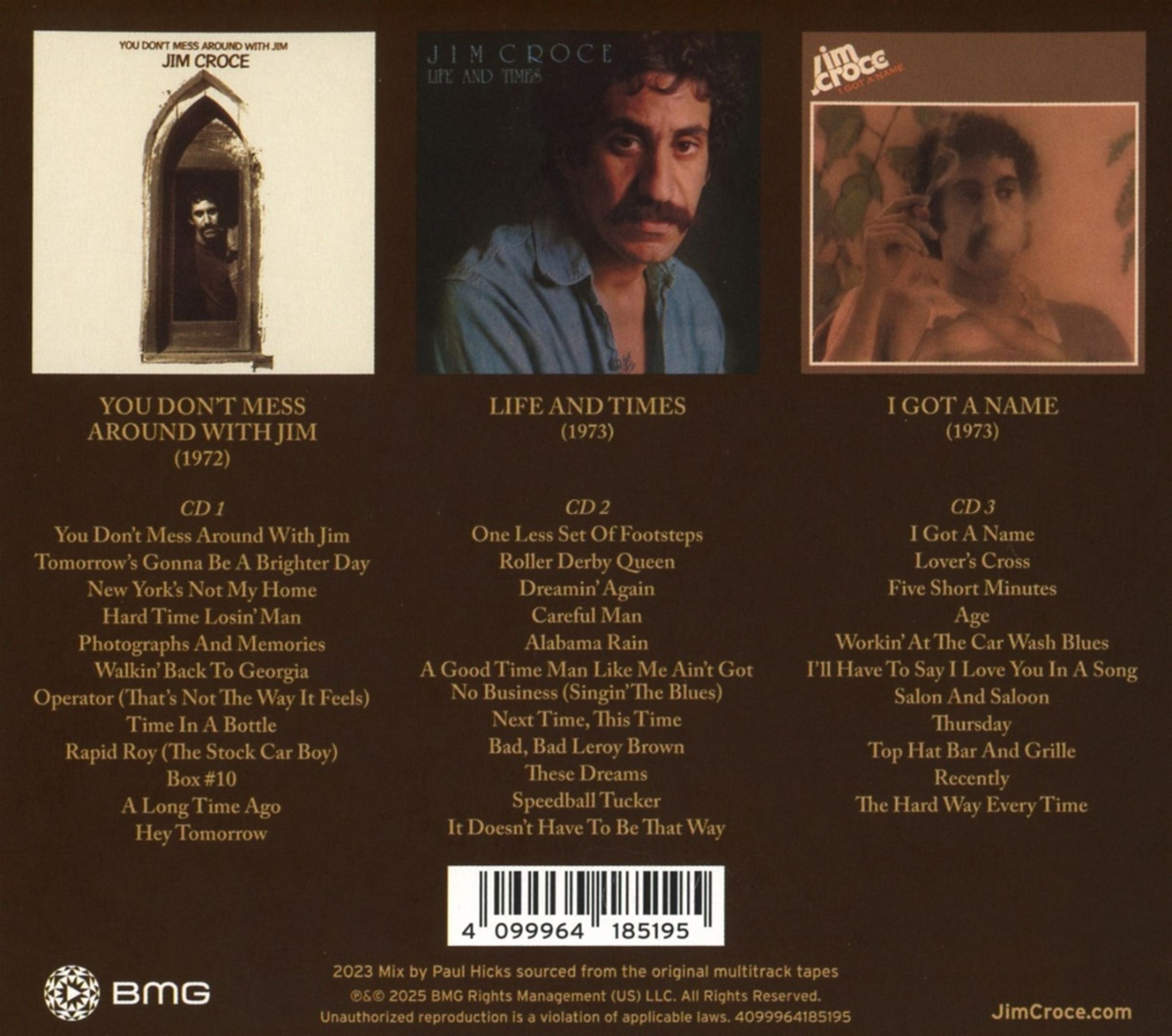 Alle drei Alben enthalten aktualisierte Mixe von Paul Hicks (George Harrison, John Lennon). CD 1 ist das 1972 erschienene Studioalbum »You Don't Mess Around with Jim«. Das Album erreichte Platz 1 und ist mit GOLD ausgezeichnet. Es enthält die Nr.-1-Single »Time In A Bottle« sowie die Hits »You Don't Mess Around With Jim« und »Operator (That's Not The Way It Feels). CD 2 ist das 1973 erschienene Studioalbum »Life and Times«. Das Album erreichte die Top 10 und ist mit GOLD ausgezeichnet. Es enthält die GOLD #1-Single »Bad, Bad Leroy Brown« sowie den Hit »One Less Set Of Footsteps«. CD 3 ist das letzte Studioalbum von Jim Croce, »I Got A Name«, das 1973 erschien. Das Album erreichte Platz 2 und ist mit GOLD ausgezeichnet. Es enthält die Top 10-Hits »I'll Have To Say I Love You In A Song« und »I Got A Name« sowie den Top 40-Hit »Workin' At The Car Wash Blues«.