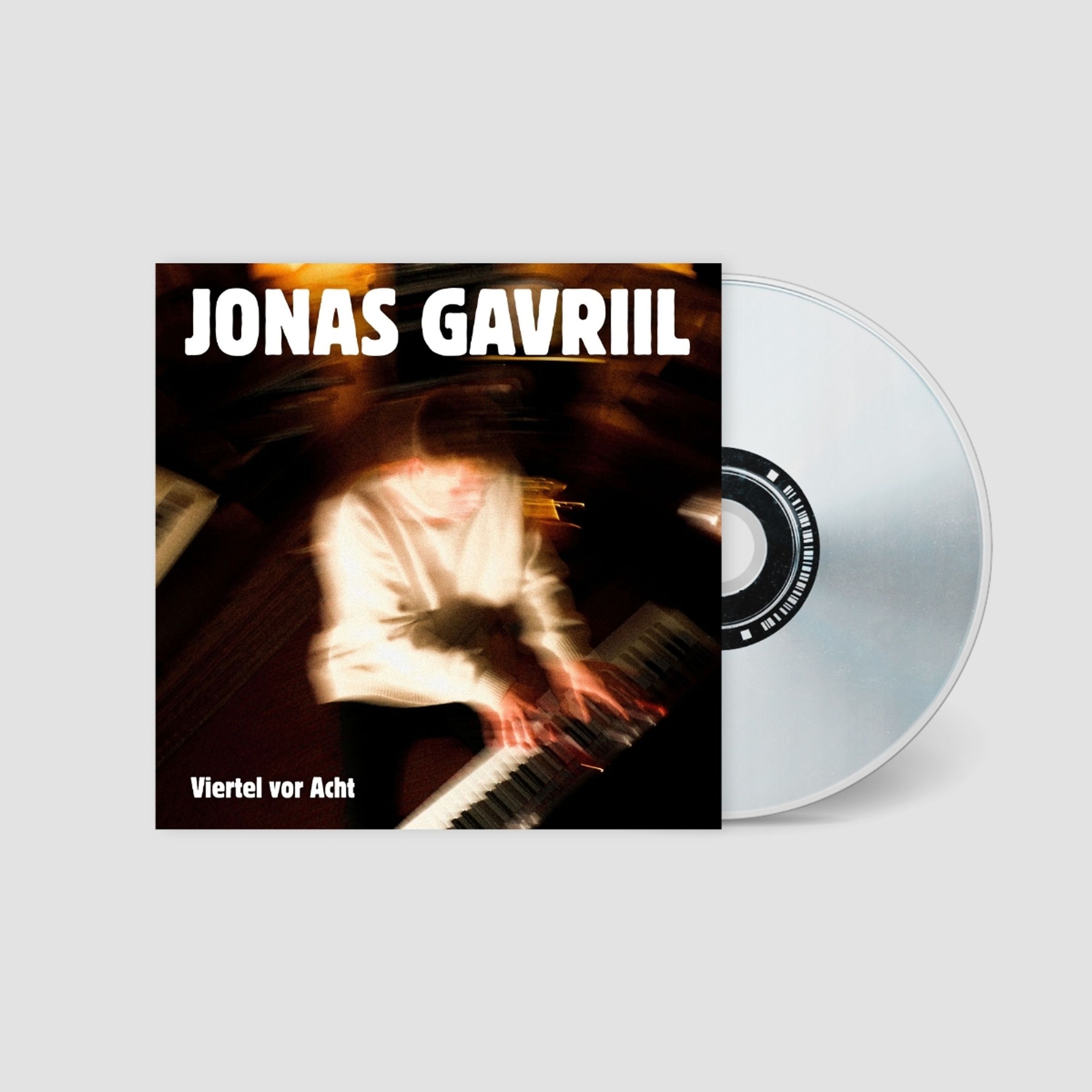 „JONAS GAVRIIL“ oben, „Viertel vor Acht“ unten. Weiche, verschwommene Darstellung einer Person am Keyboard., CD