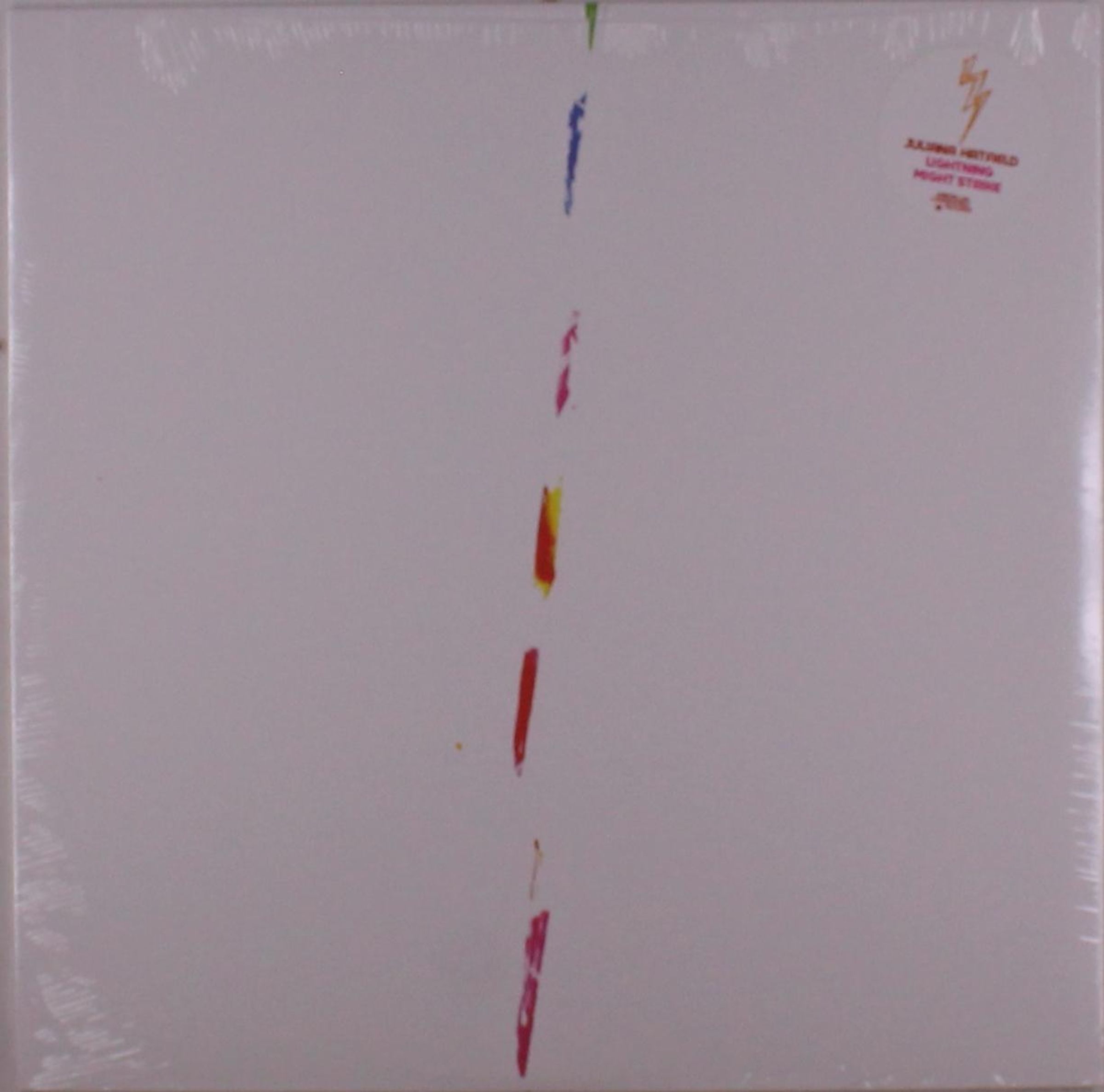 Albumtitel: "Lightning Night Strike". Blitze-Logo. Weiße Oberfläche mit bunter, vertikaler Linie., LP