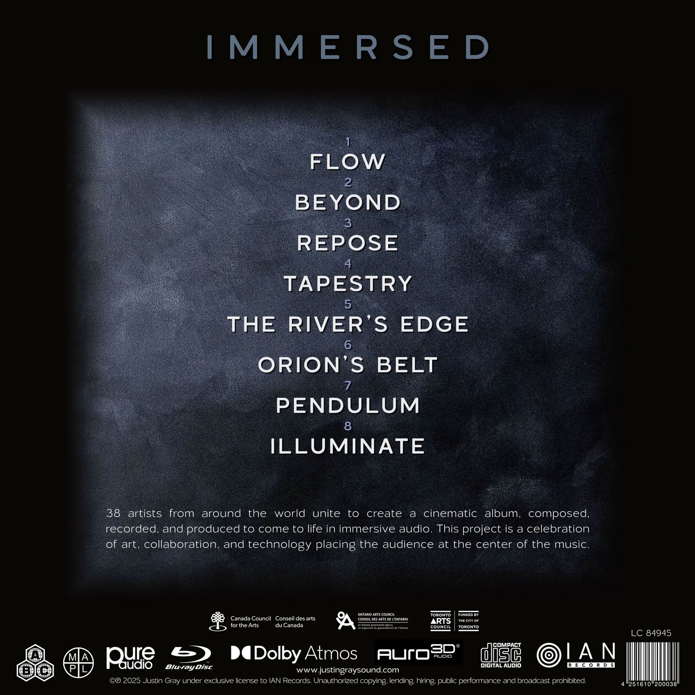 Das Projekt mit 38 Künstlern aus der ganzen Welt stellt den Hörer in den Mittelpunkt eines 360-Grad-Orchesters, umgeben von Performances aus allen Richtungen. »Immersed« wurde von dem mit dem Juno Award ausgezeichneten Bassisten, Produzenten und Tontechniker Justin Gray kreiert und zelebriert Kunstfertigkeit und Kollaboration, wobei verschiedene musikalische Einflüsse wie Jazz, indische Klassik und globale Musiktraditionen zum Tragen kommen.