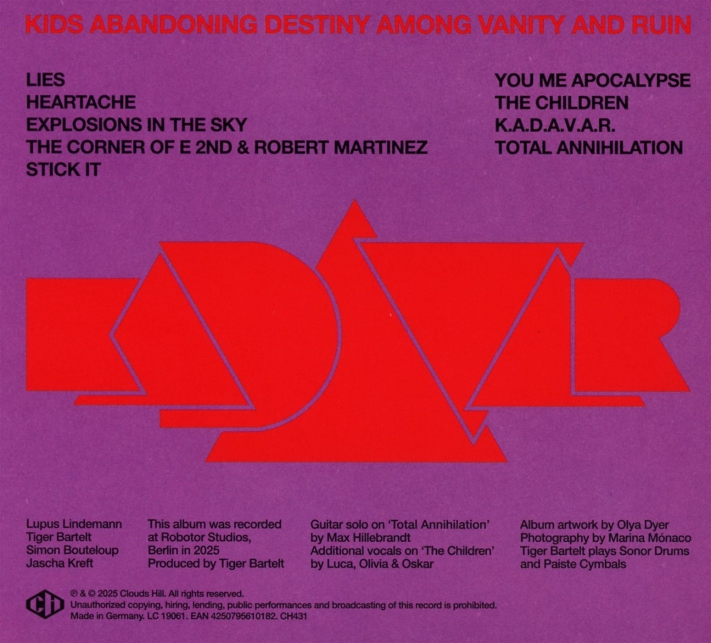 Nur wenige Monate nach dem spektakulären Neustart »I Just Want To Be A Sound« kehren Kadavar zur Quelle ihrer urwüchsigen Fuzz-Kraft zurück. »Kids Abandoning Destiny Among Vanity And Ruin« vereint Stoner, Doom und Classic Rock.