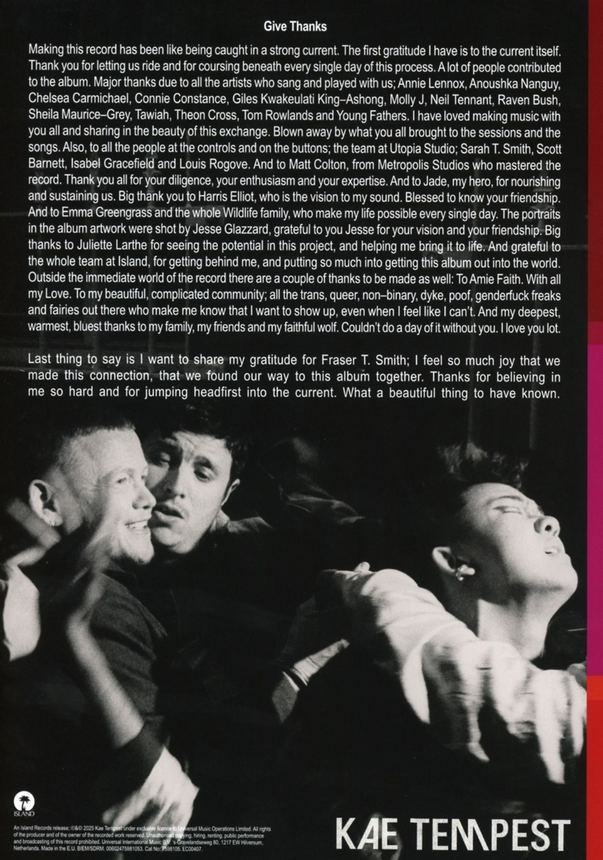Das fünfte Studioalbum »Self Titled« ist Kaes bisher intimstes und offenkundigstes Album. »Self Titled« erforscht nicht nur, wer Kae als Artist:in ist, sondern zeigt Kae als Person. Es ist mutig, witzig und bewegend. Im Kern ist »Self Titled« ein Liebesbrief an Tempests jüngeres Ich - ein Gespräch über die Zeit hinweg, geprägt von den Menschen, Orten und Erfahrungen, die Kae ausmachen. Zu den Features gehören Neil Tennant, Young Fathers, Connie Constance und Tawiah.
