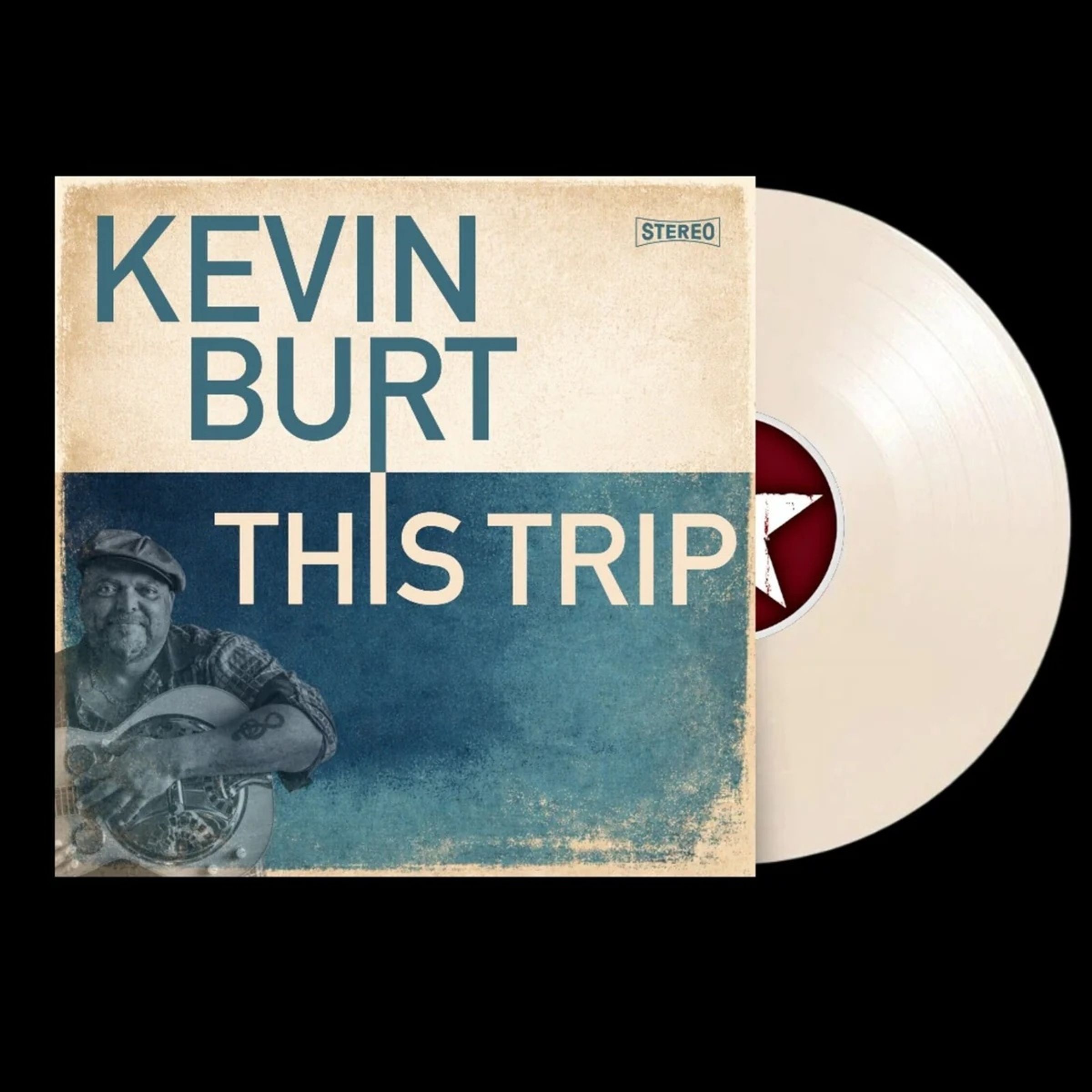 "KEVIN BURT THIS TRIP" steht in großen Buchstaben. Unten links spielt ein Mann Gitarre, trägt eine Mütze und schaut nach vorne., LP