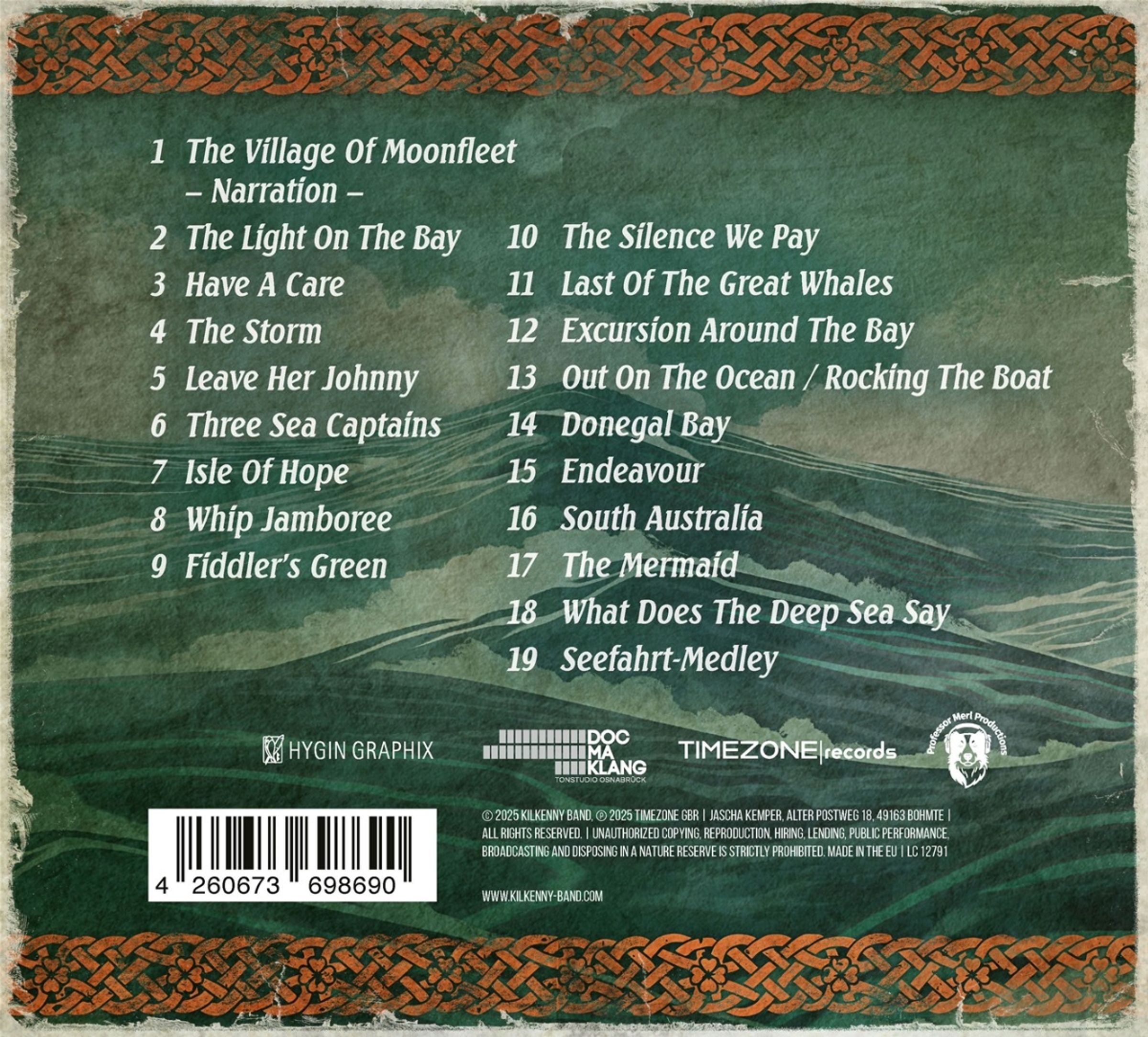„Stormy Seas Ahead“ und „Kilkenny Band“. Illustration von fünf Personen in einem Boot in bewegter See., CD