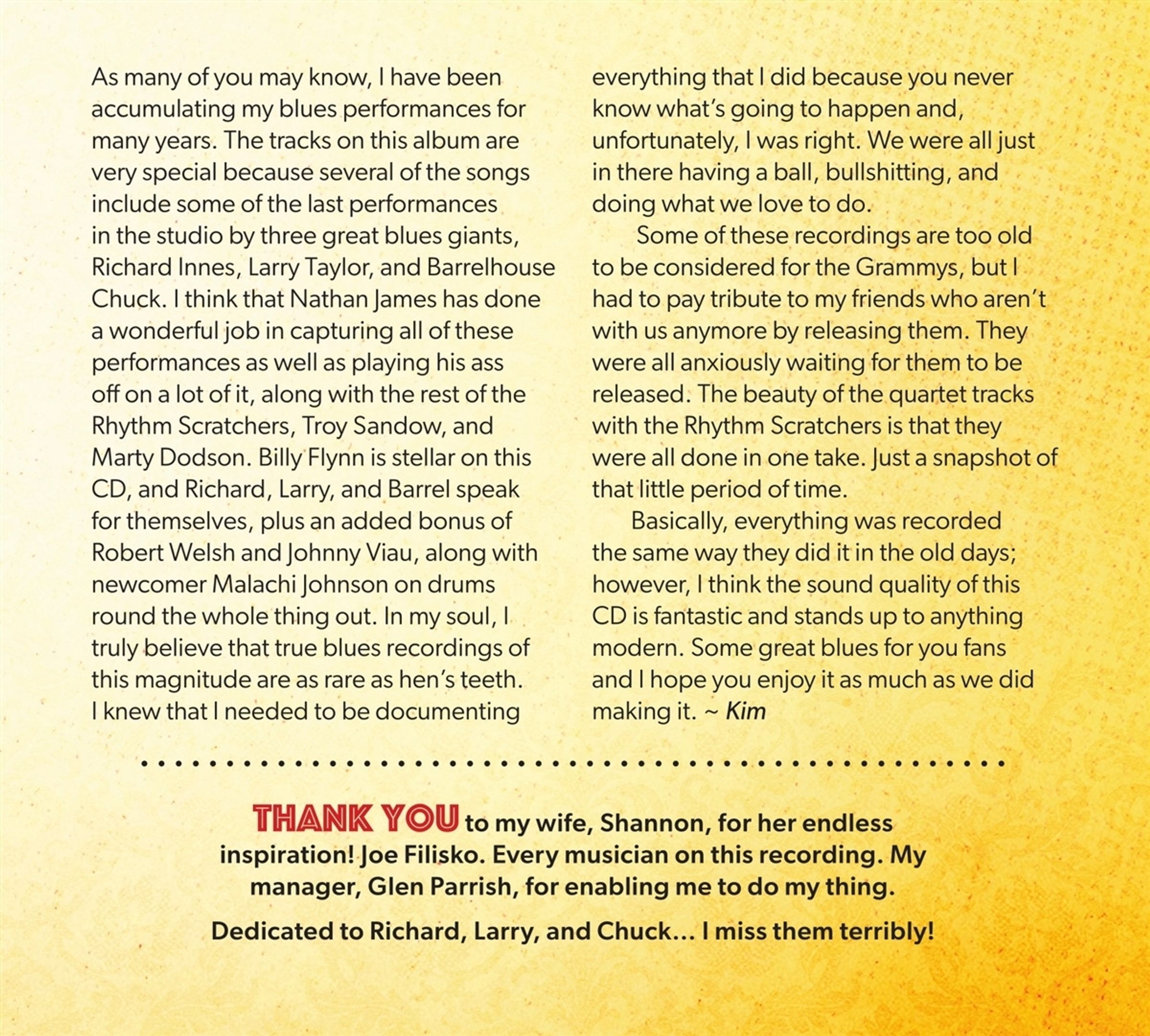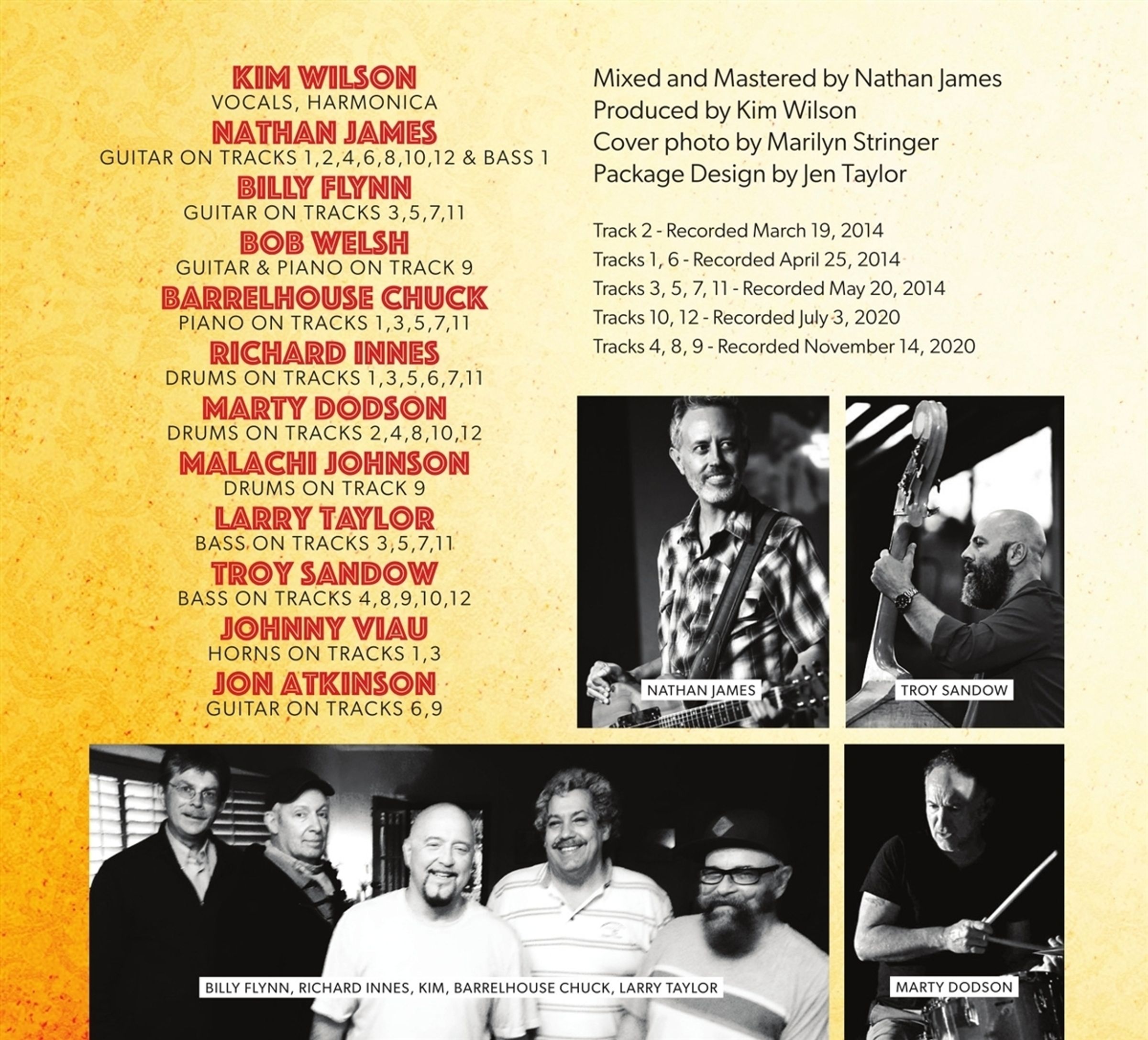 Die Aufnahmen von Kim Wilson (Gesang/Mundharmonika) sind wunderbar. Dieses Album wurde hauptsächlich in zwei Sessions aufgenommen – eine 2014 und eine weitere 2020. Es enthält ausschließlich bisher unveröffentlichte Songs und präsentiert drei verstorbene Blues-Größen: Schlagzeuger Richard Innes, Pianist Barrelhouse Chuck und den ehemaligen Canned-Heat-Bassisten Larry Taylor.