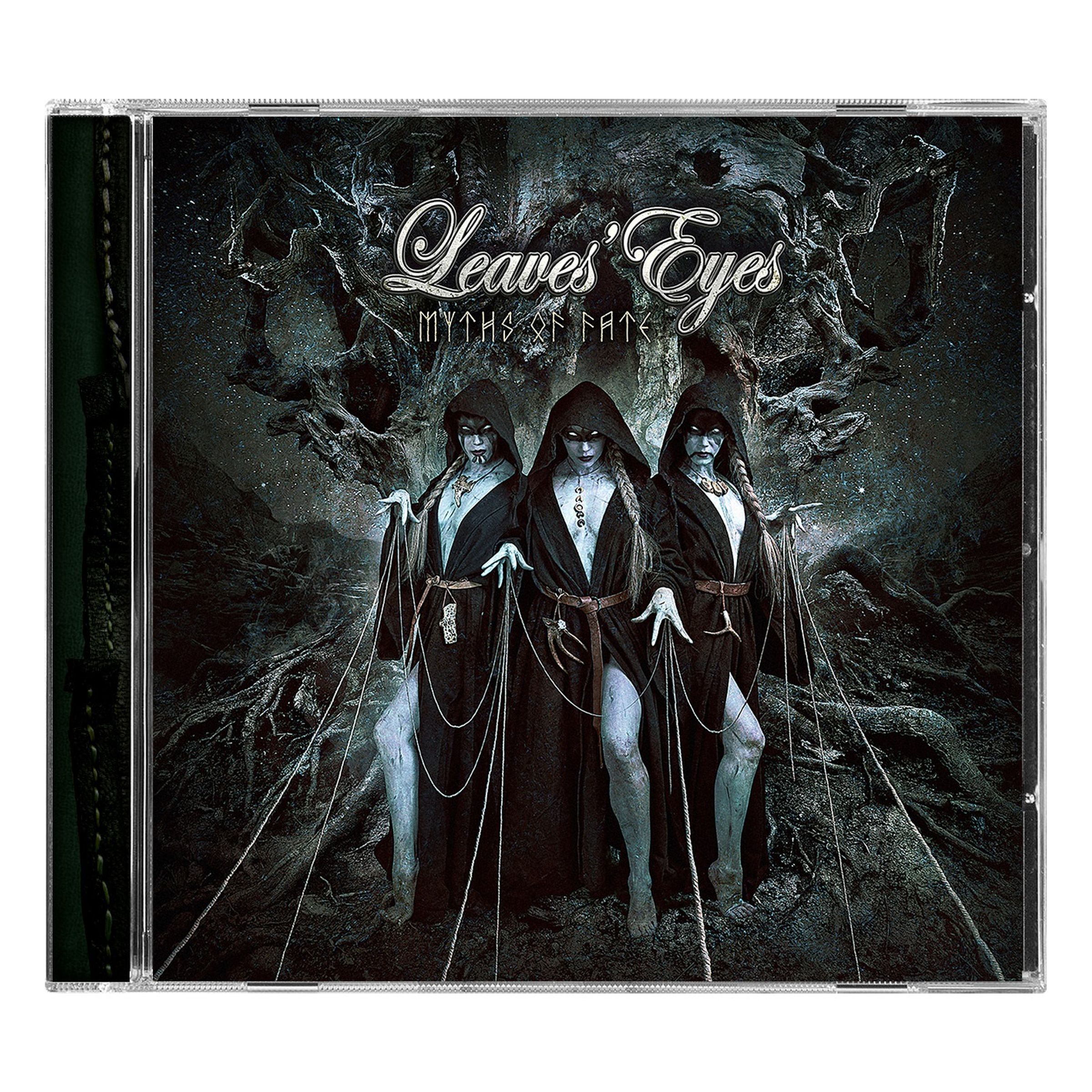 "Leaves' Eyes Mythos of Fate". Drei Figuren in schwarzen Roben, die Fäden halten, vor einem mystischen Hintergrund., CD
