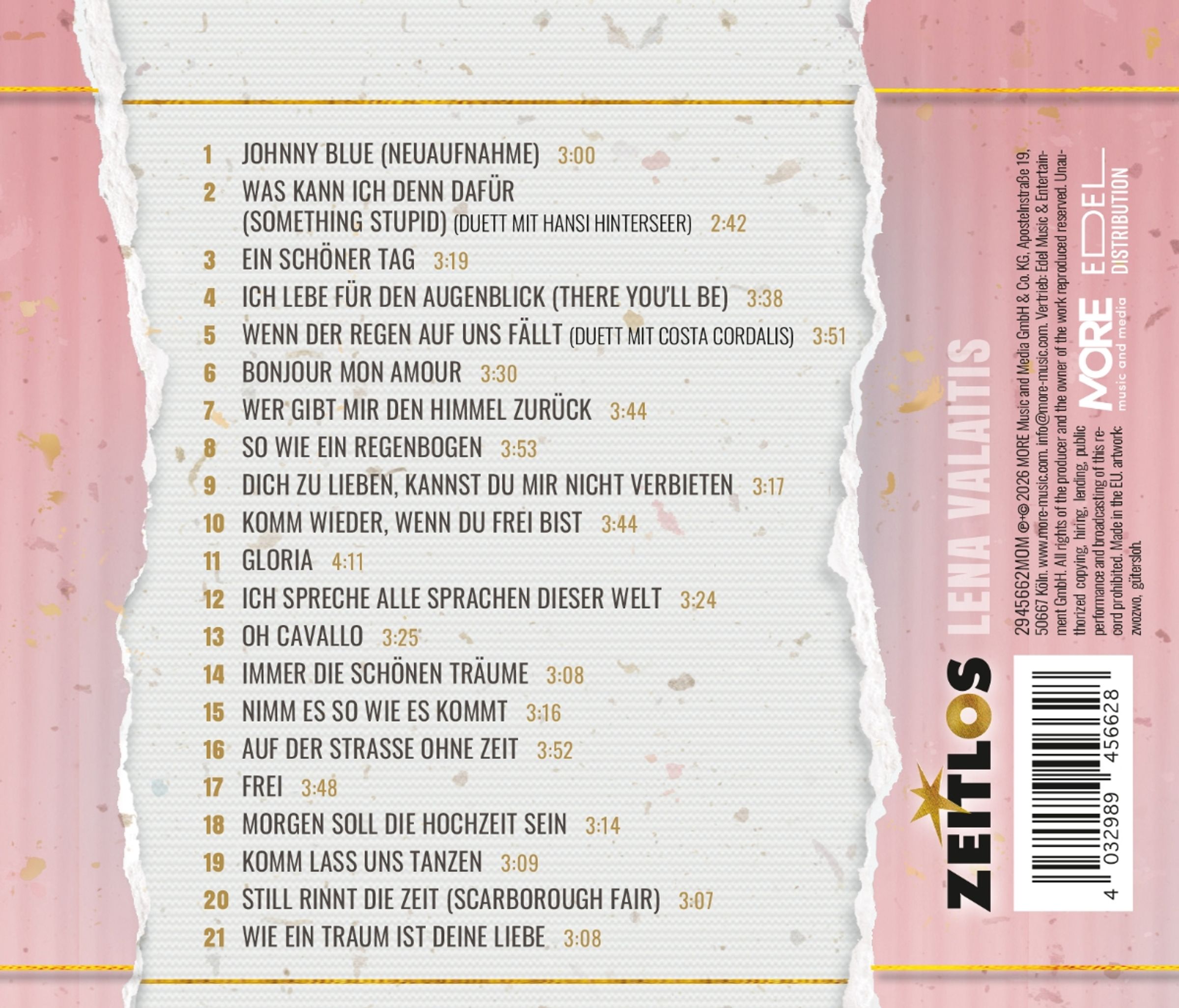 Lena Valaitis betrat die Bühne Anfang der 1970er Jahre und feierte schnell Erfolge mit „So wie ein Regenbogen“, „Bonjour mon amour“ oder auch „Wer gibt mir den Himmel zurück“. Ihren großen Durchbruch hatte sie 1981, als sie mit „Johnny Blue“ den 2. Platz beim Eurovision Song Contest in Dublin belegte. Selbstverständlich ist „Johnny Blue“ in einer Neuaufnahme auf „ZEITLOS“ enthalten, ebenso wie ihre späteren Duette mit Hansi Hinterseer „Was kann ich denn dafür“ („Something Stupid“) und Costa Cordalis „Wenn der Regen auf uns fällt“ („When The Rain Begins To Fall“). Längst war es überfällig, dass die beliebte Reihe „Zeitlos“ Lena Valaitis eine Ausgabe widmet!