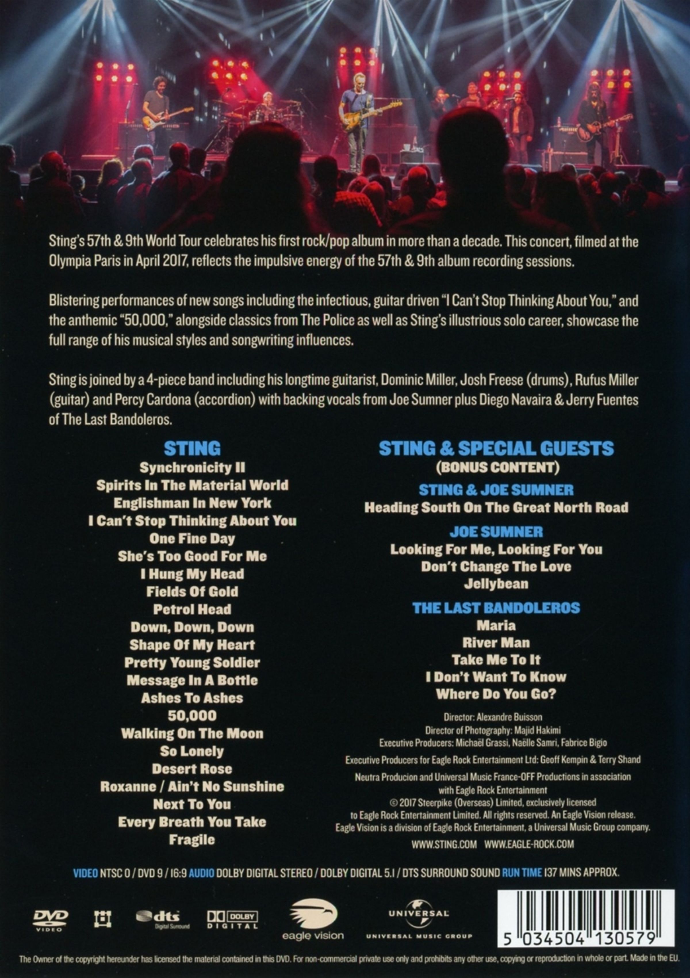 Gleich zwei Mal verkaufte Sting am 12. und 13. April 2017 das Pariser Olympia aus. Mit »Live At The Olympia Paris« gibt es jetzt den Konzertfilm dieser besonderen Performances auf DVD und Blu-ray.