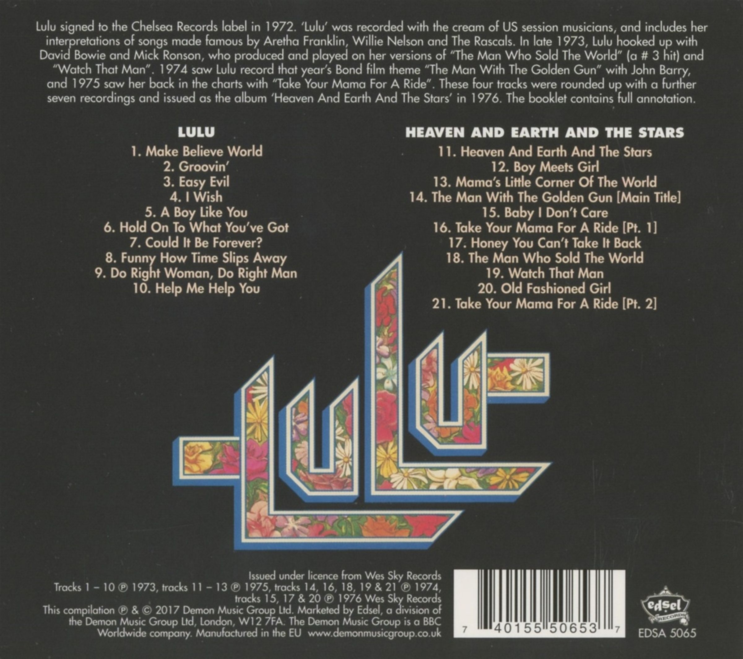 ›Lulu‹ entstand mit diversen namenhaften US-Session-Musikern und enthält u. a. Songs von Aretha Franklin, Willie Nelson, The Rascals und David Cassidy. 1973 halfen ihr David Bowie und Mick Ronson bei ›The Man Who Sold The World‹ und ›Watch That Man‹, beides Bowie-Tracks. 1974 kam ›The Man With The Golden Gun‹ mit Bond-Komponist John Barry. Danach folgte mit ›Take Your Mama For A Ride‹ ein weiterer Chart-Hit. Letztere sind alle vertreten auf ›Heaven And Earth And The Stars‹, dem zweiten, hier enthaltenen Album, das 1976 veröffentlicht wurde. Booklet mit Linernotes von Alan Robinson.