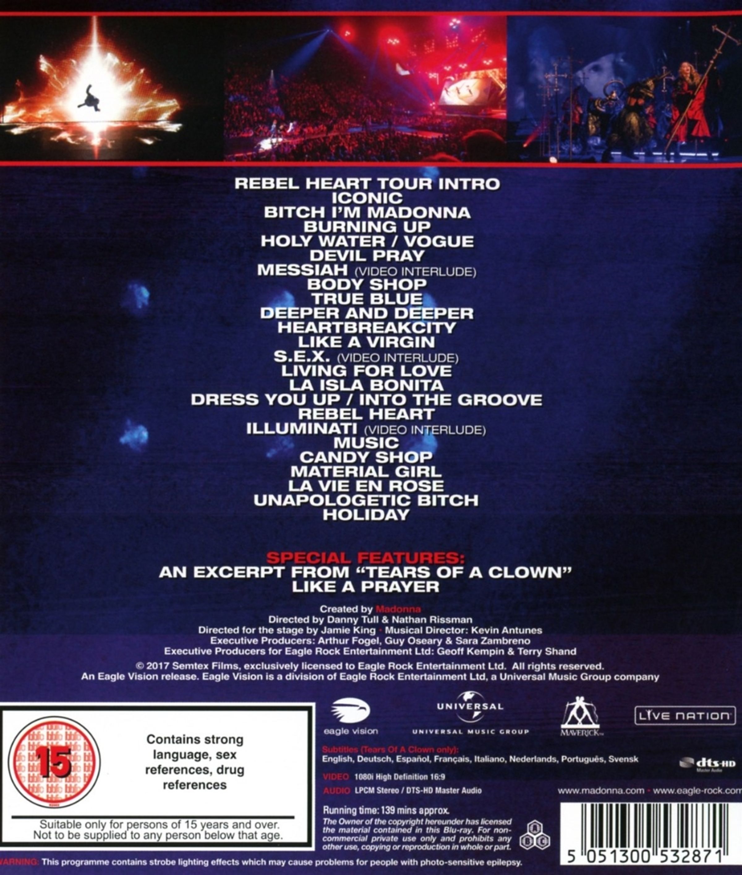 Das Tracklisting von DVD, Blu-ray und Doppel-CD spricht Bände: neue Songs von Madonnas Nummer-eins-Album »Rebel Heart« von 2015 und Welthits aus ihrem gesamten Repertoire, aufgenommen bei ihren Shows in der Qudos Bank Arena (früher Allphones Arena) in Sydney, Australien, im März 2016 warten auf »Rebel Heart Tour«. Hinzu kommen Mitschnitte aus den unterschiedlichsten Locations rund um den Globus, darunter zahlreiche unveröffentlichte Aufnahmen von der Bühne und hinter den Kulissen. Das jeweilige Tracklisting finden Sie im Folgenden.