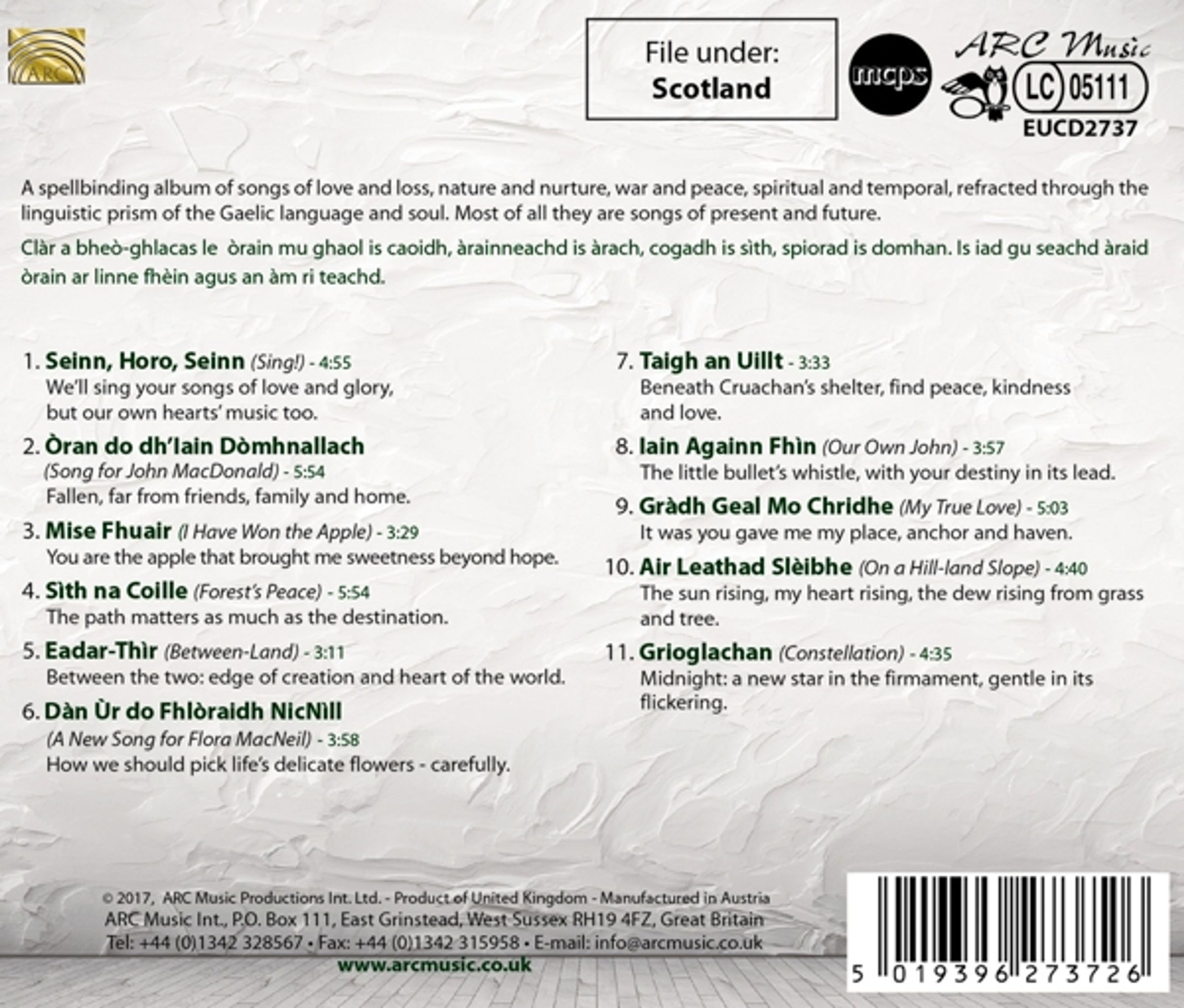 Die vielfach preisgekrönte Künstlerin und BBC-Berühmtheit Mary Ann Kennedy präsentiert ihr erstes Soloalbum, ein fesselndes und bezauberndes Album mit Liedern über Liebe und Verlust, Natur und Erziehung, Krieg und Frieden, Geistiges und Weltliches, gebrochen durch das sprachliche Prisma der gälischen Sprache und Seele. Booklet mit ausführlichen Informationen auf Englisch und Gälisch.