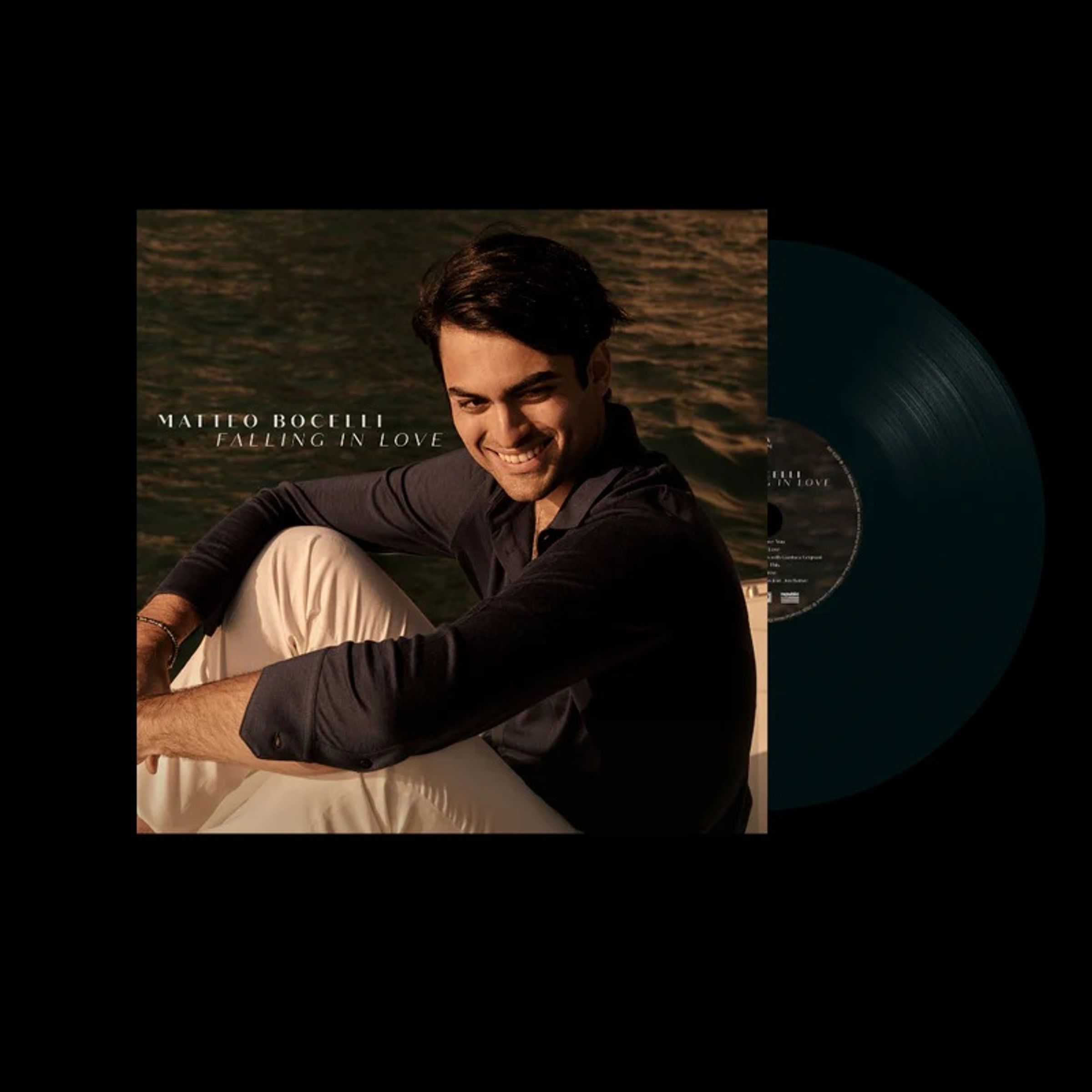 "MATTEO BOCELLI FALLING IN LOVE" steht auf einem Plattencover. Ein lächelnder Mann sitzt am Wasser., LP