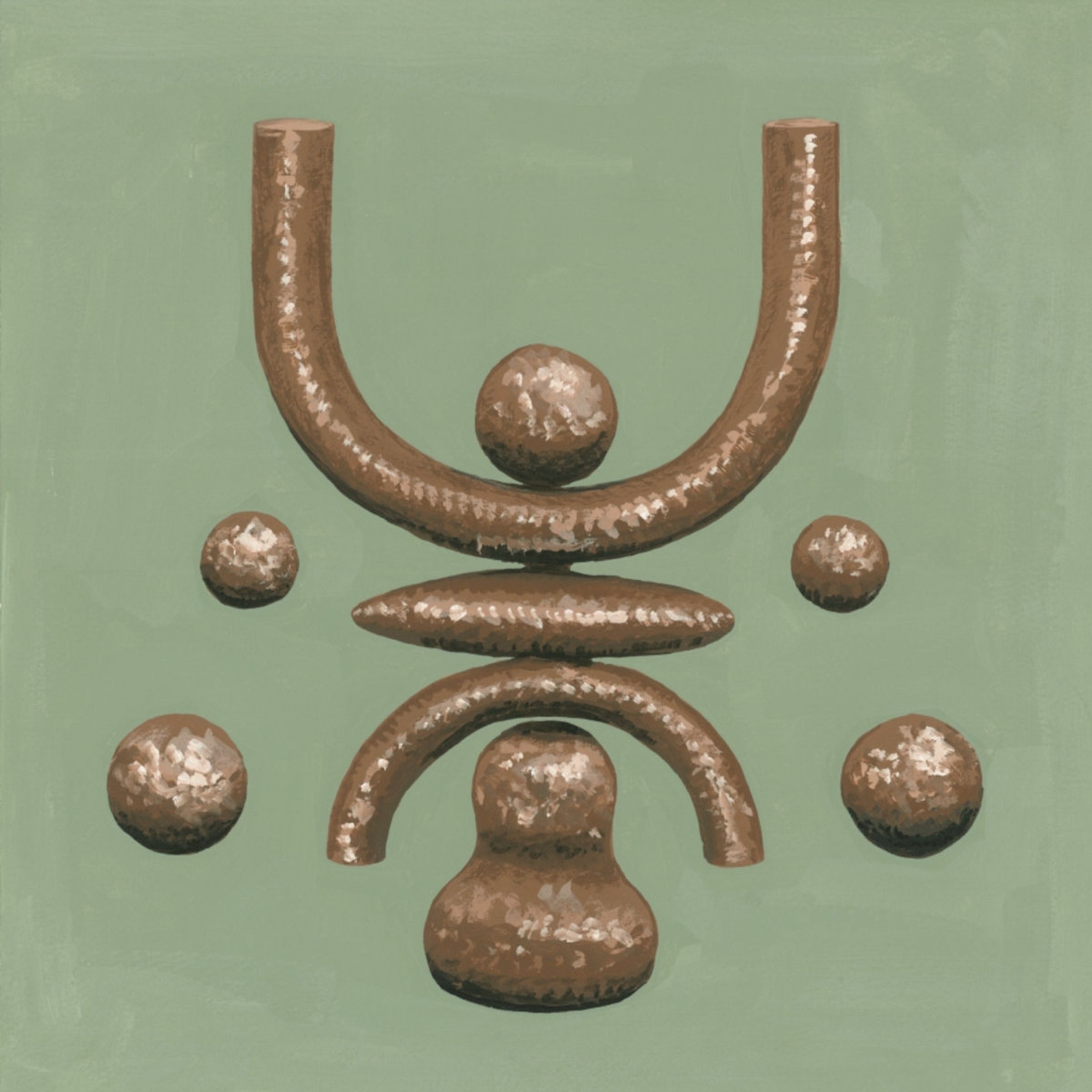 Abstrakte Anordnung aus bronzefarbenen Formen vor grünem Hintergrund: U-förmig, Kugeln, oval und gebogen., LP