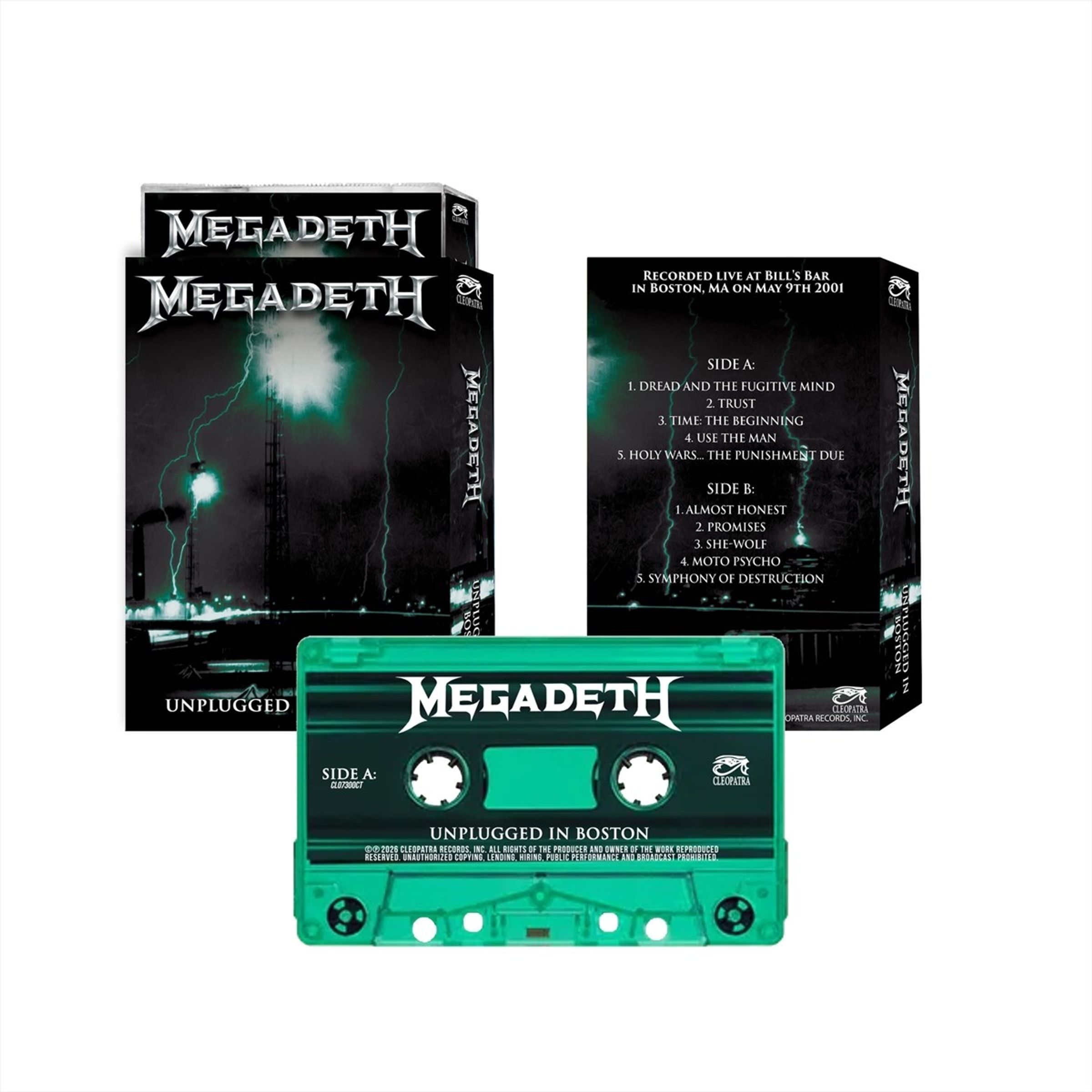 Megadeth-Logo, Titel "Unplugged in Boston", Tracklist, grüne Kassette, Blitze im Hintergrund., MC