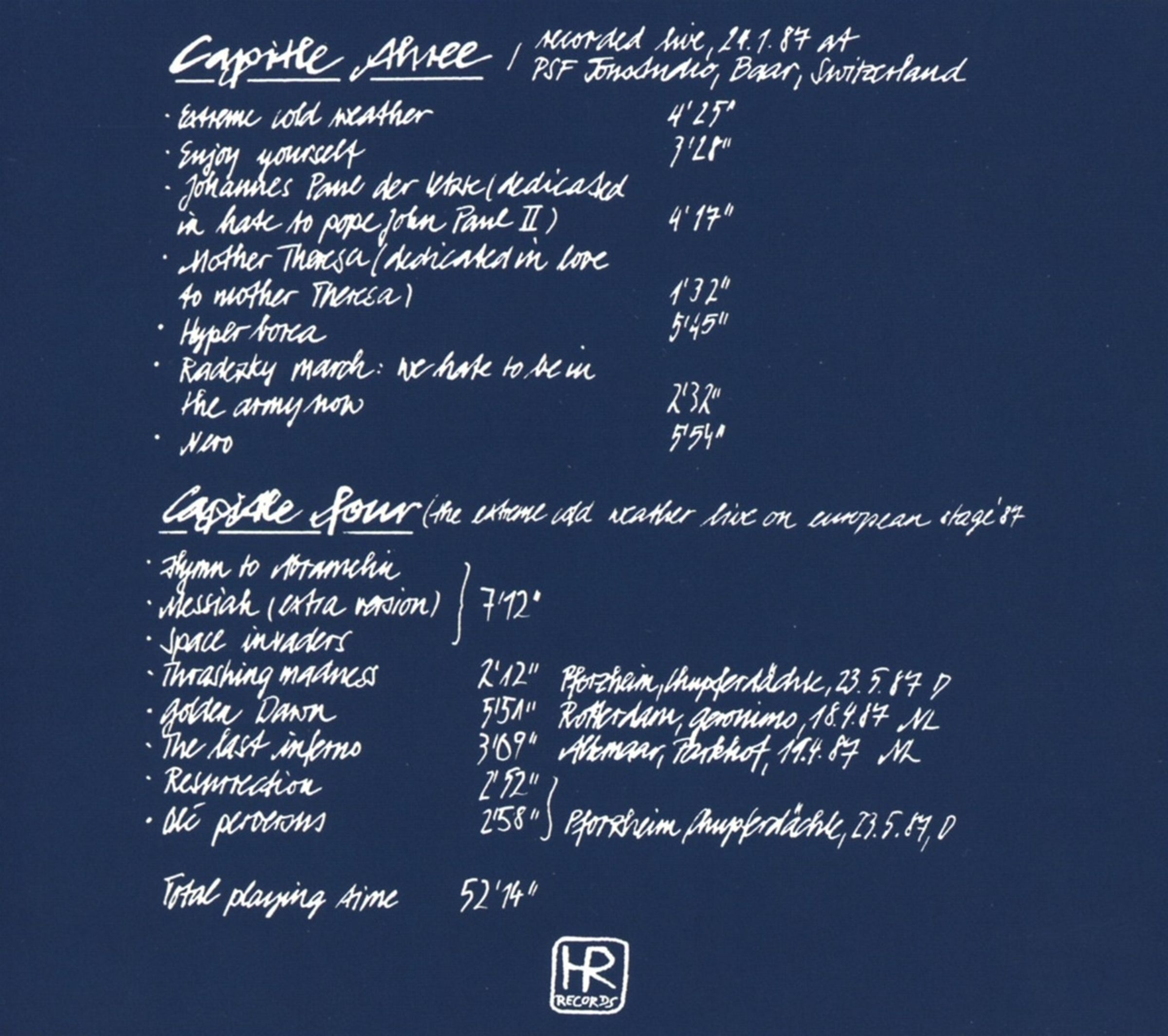 »Extreme Cold Weather« war Messiahs zweites Album und erschien 1987 auf dem nicht mehr existenten Label Chainsaw Murder. Wieder hatte die Band in einem kleinen Studio daheim in Baar aufgenommen, und wieder ohne professionelle Unterstützung Aufnahmen und Mix allein gestemmt. Vielleicht ist das mit ein Grund, warum »Extreme Cold Weather« sich zu einem Kultalbum einer Band entwickelte, die im Vergleich mit ihren Zeitgenossen immer sowohl obskur als auch herausragend war.