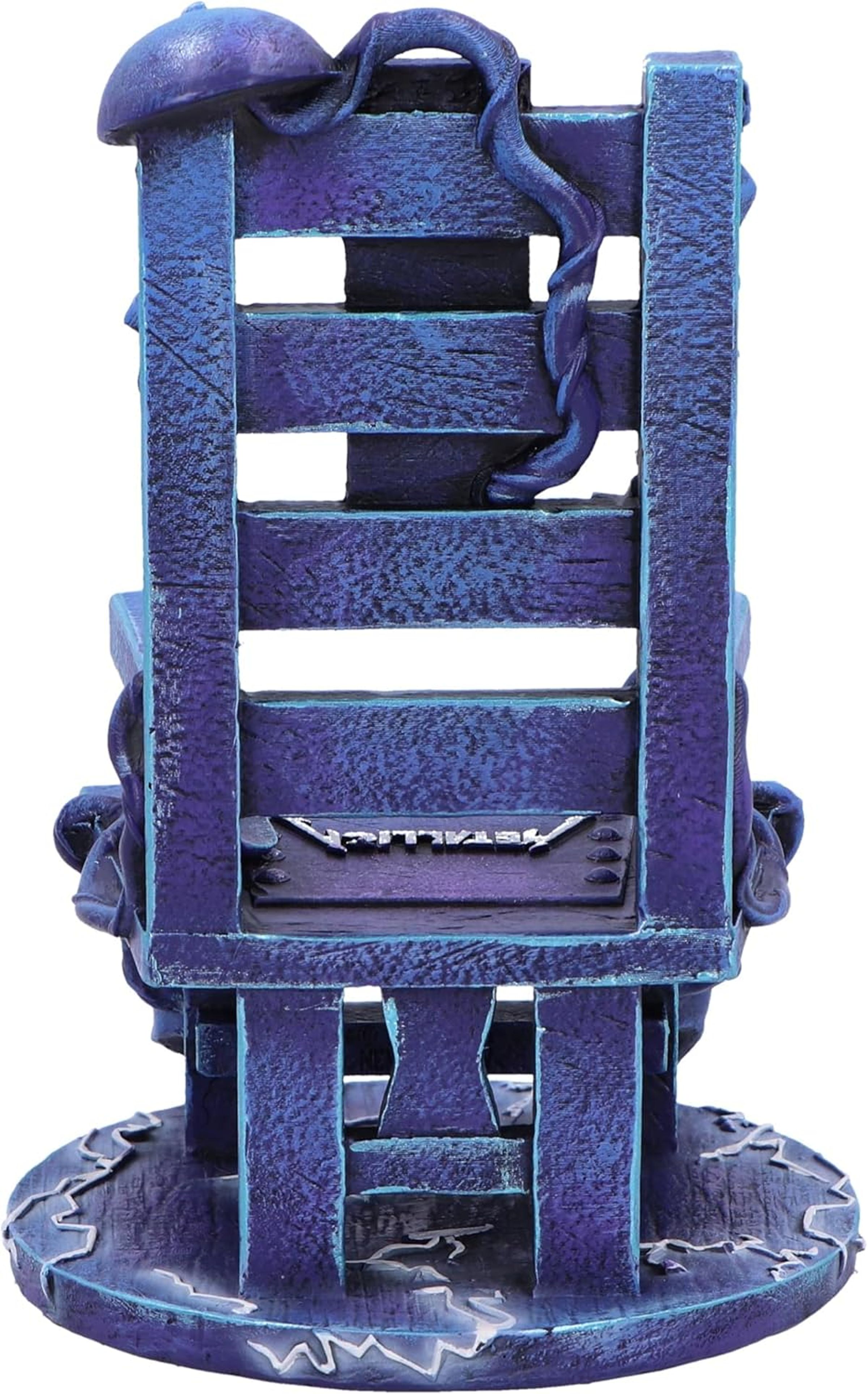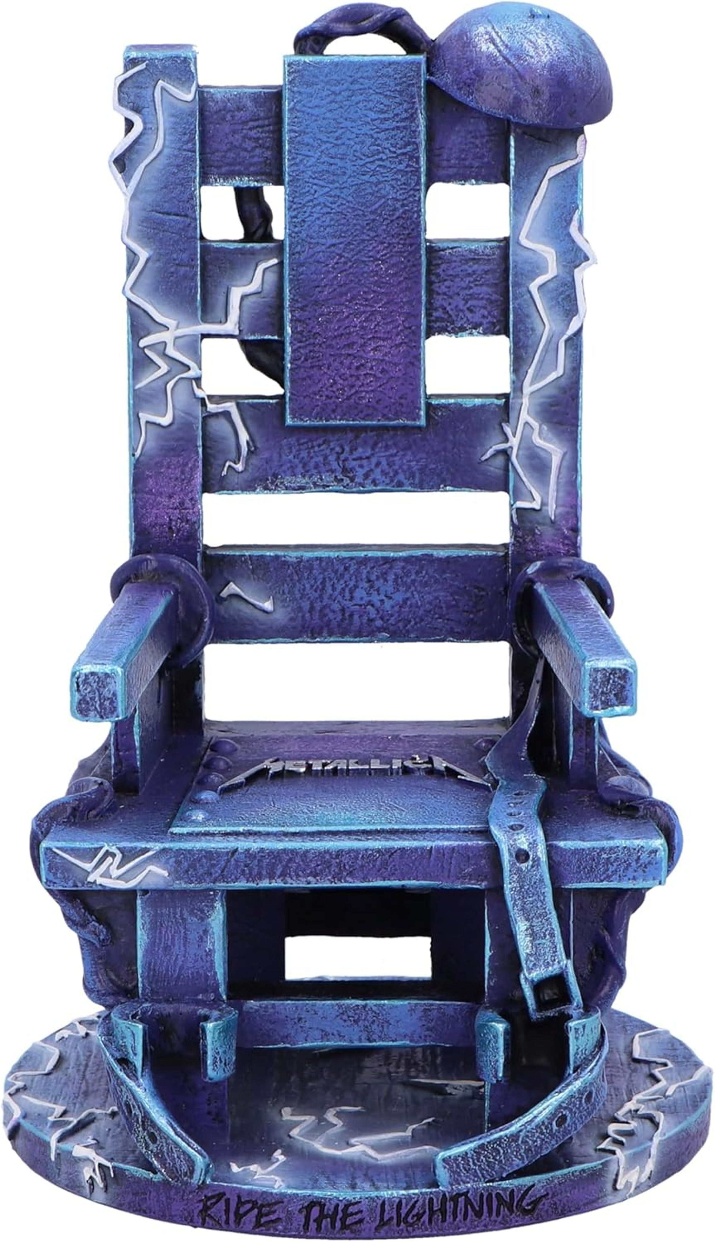 Aufschrift "RIDE THE LIGHTNING" unten. Gefangenenstuhl in Blau- und Lila-Tönen mit Blitzen verziert., Merchandise