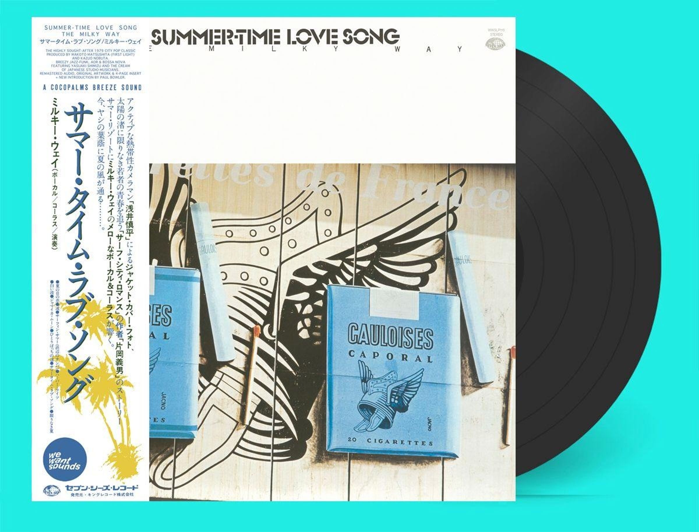 "SUMMERTIME LOVE SONG", japanischer Text vertikal, Palmenillustration, Schachteln Zigaretten, Schmetterlingsflügelzeichnung., LP