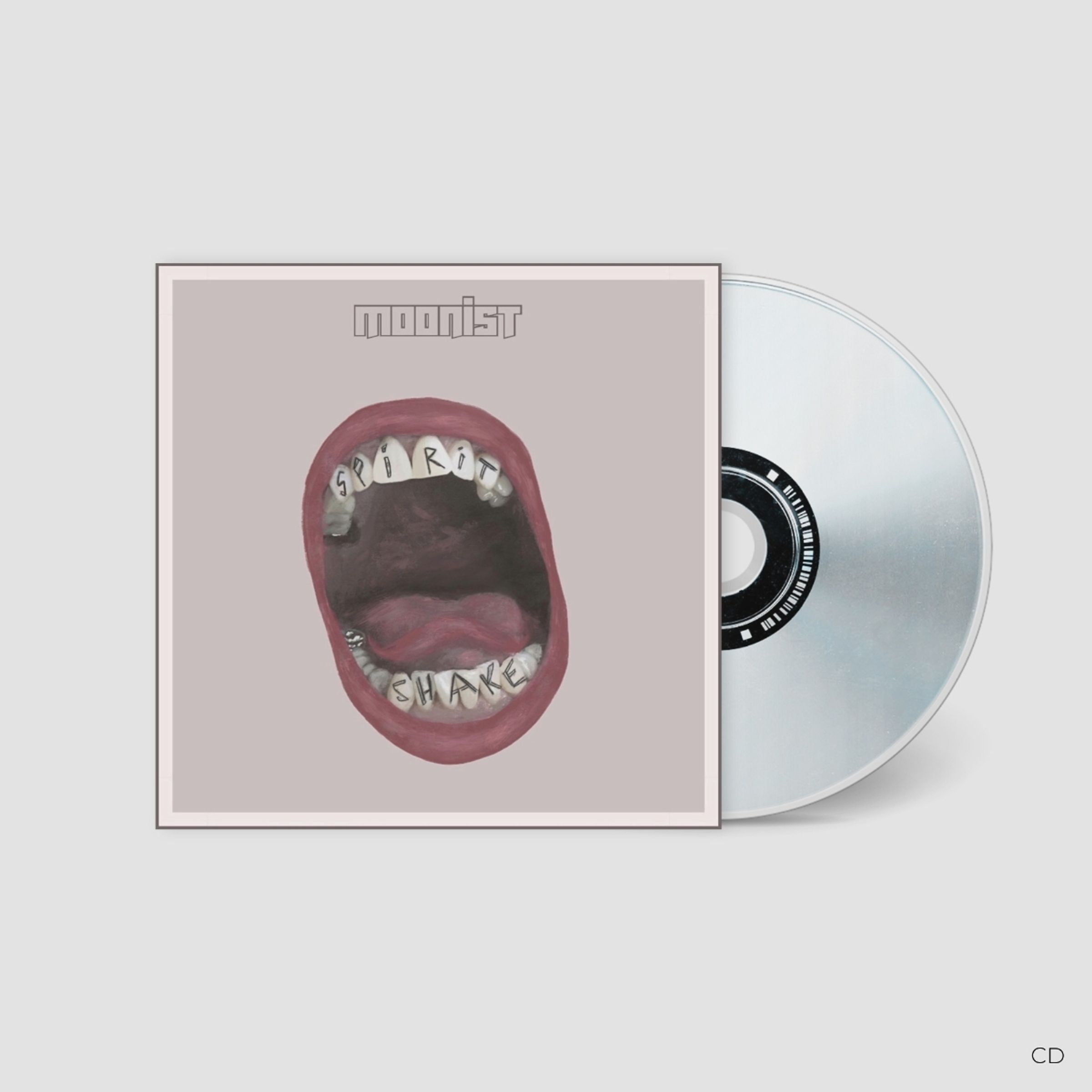 "Spirit Shake" steht auf den Zähnen eines weit geöffneten Mundes gemalt. Oben steht in stilisierter Schrift "moonist"., CD