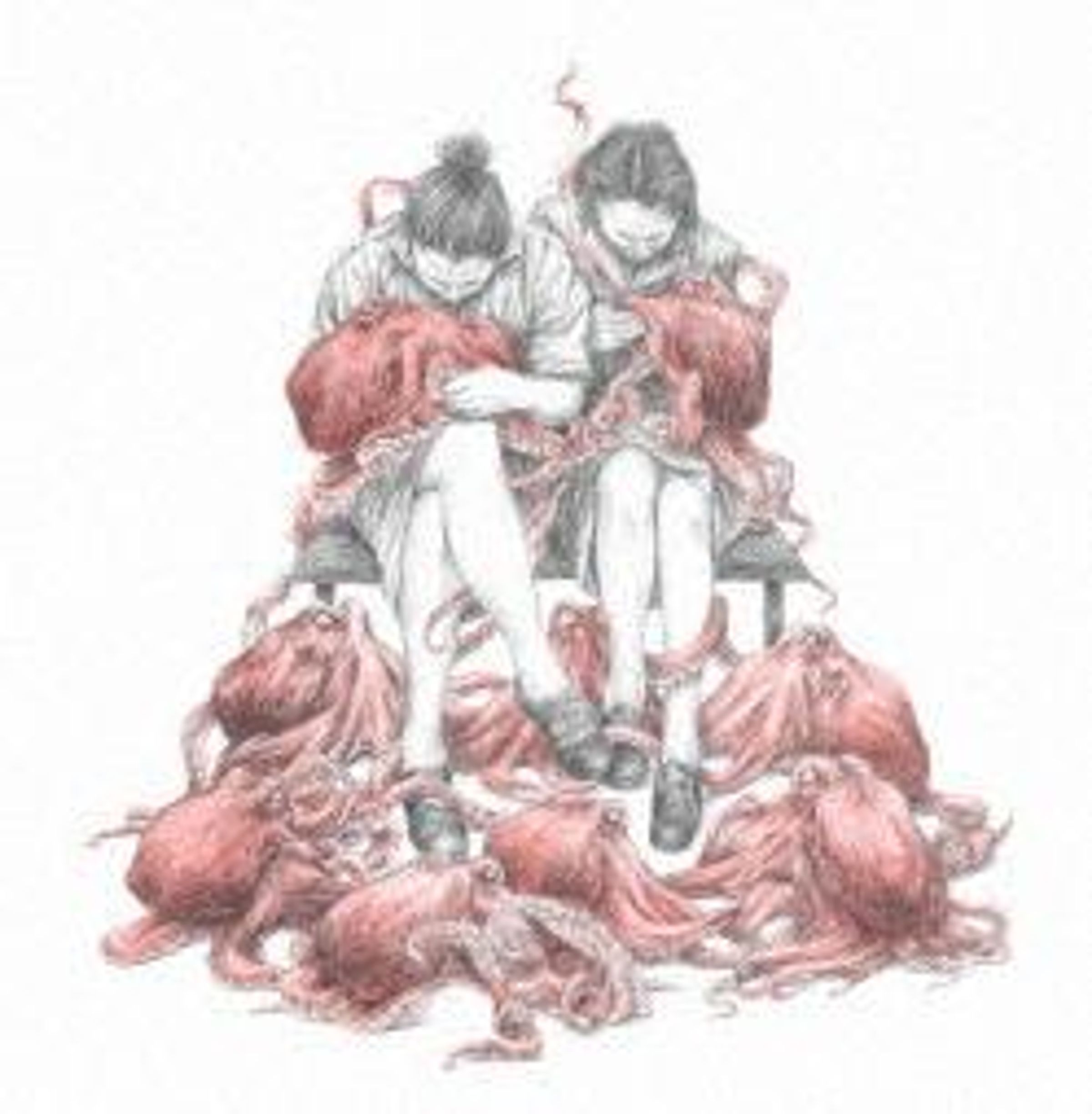 Zwei Personen sitzen und arbeiten an mehreren roten, krakenähnlichen Kreaturen, die um sie herum verteilt sind., CD