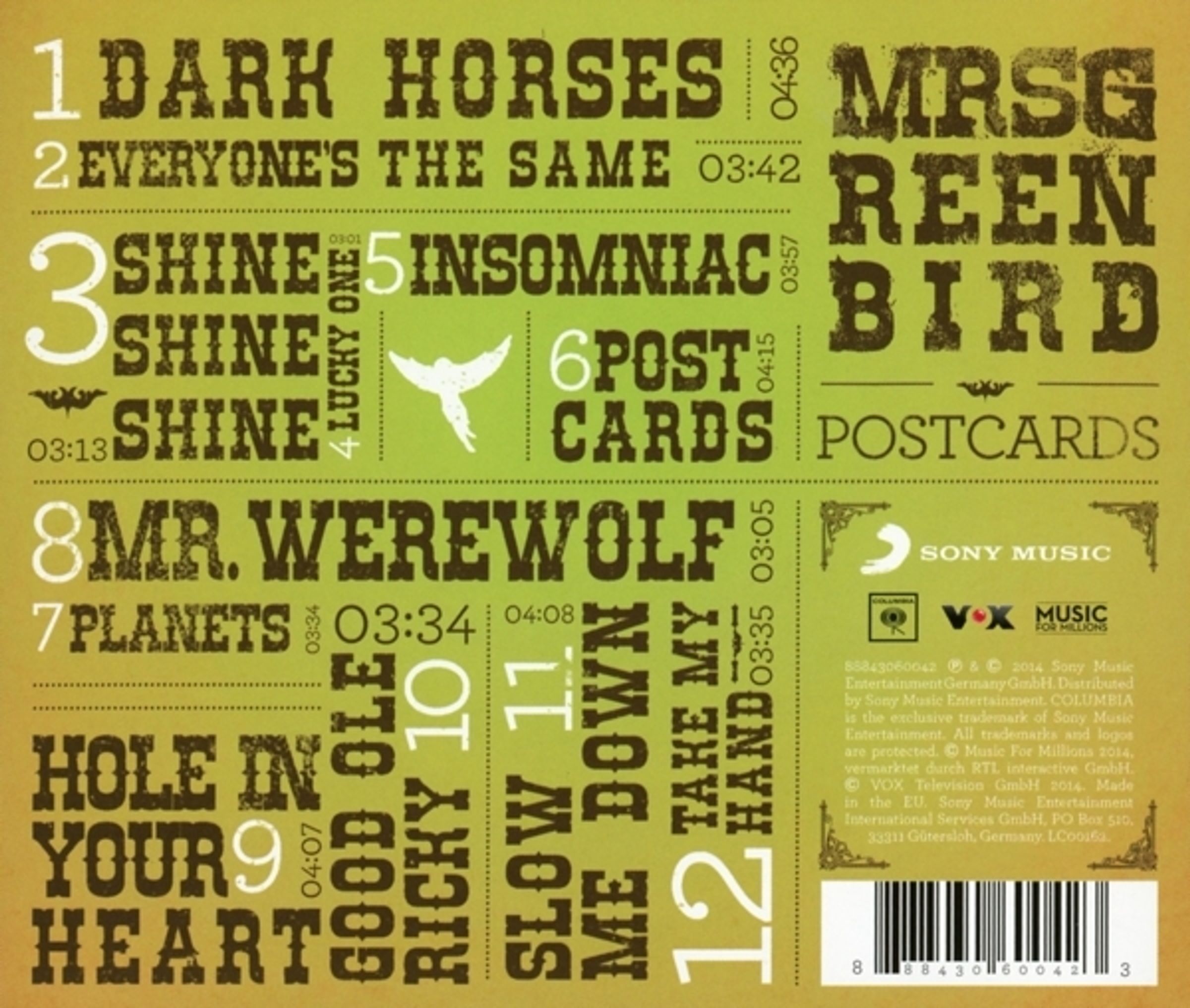 Durch ihre 12 Eigenkompositionen ziehen sich kleine, mitunter verschrobene Geschichten mit einem roten Faden: mal mehr, mal weniger offensichtlich geht es um Ermutigung. Auf dass mehr Menschen den Mut finden mögen, ihre eigene Geschichte zu schreiben. So selbstsicher wie Sarah & Steffen als Außenseiter die VOX-Show ›X-Factor‹ gewonnen haben. So konsequent wie Mrs. Greenbird sie nun mit ›Postcards‹ fortsetzen, dem 2. Kapitel ihrer hoffentlich noch langen Erfolgsgeschichte.«
