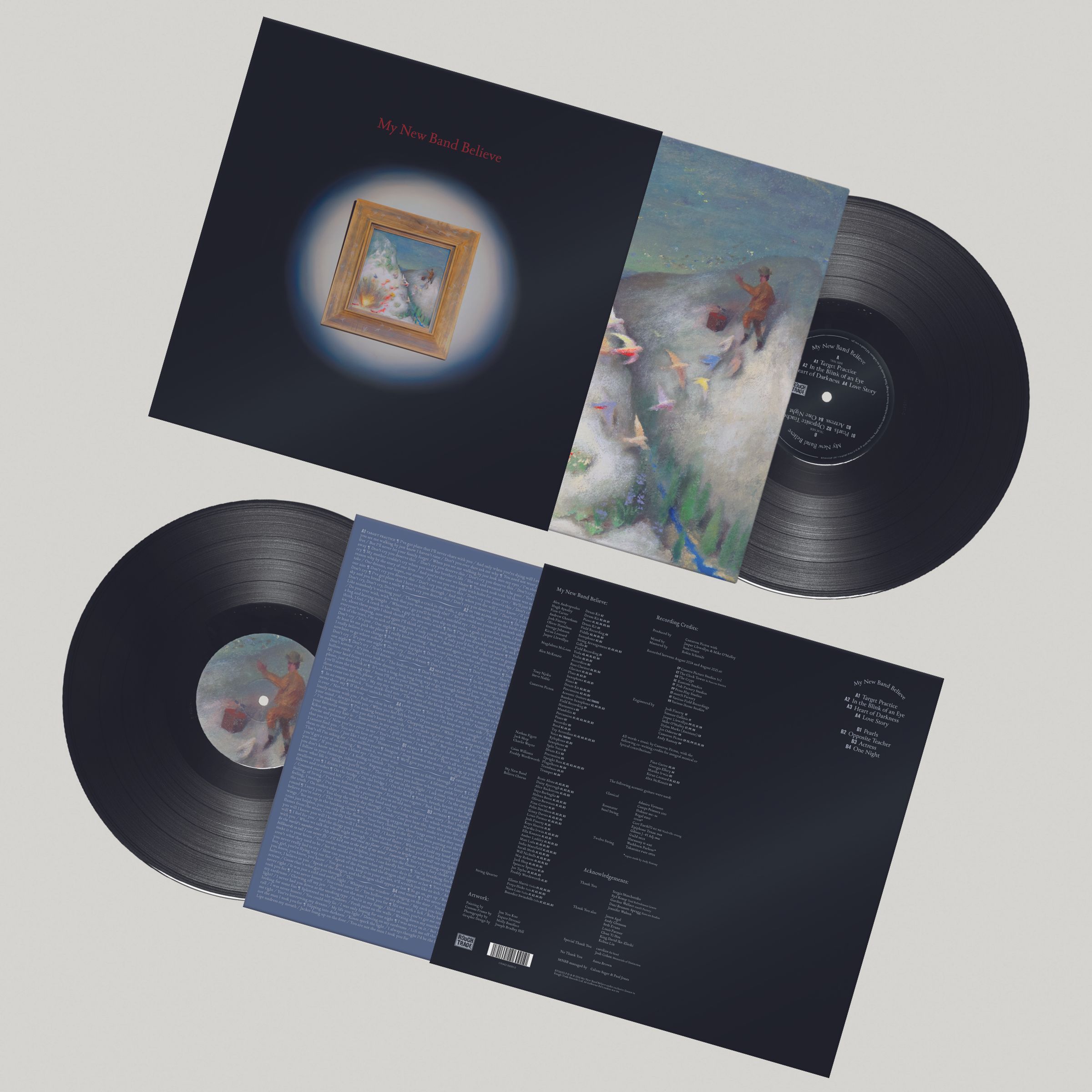 Text: "My New Band Believe." Schallplattenhülle mit einem farbenfrohen Gemälde eines Mannes und stilisiertem Rahmen., LP