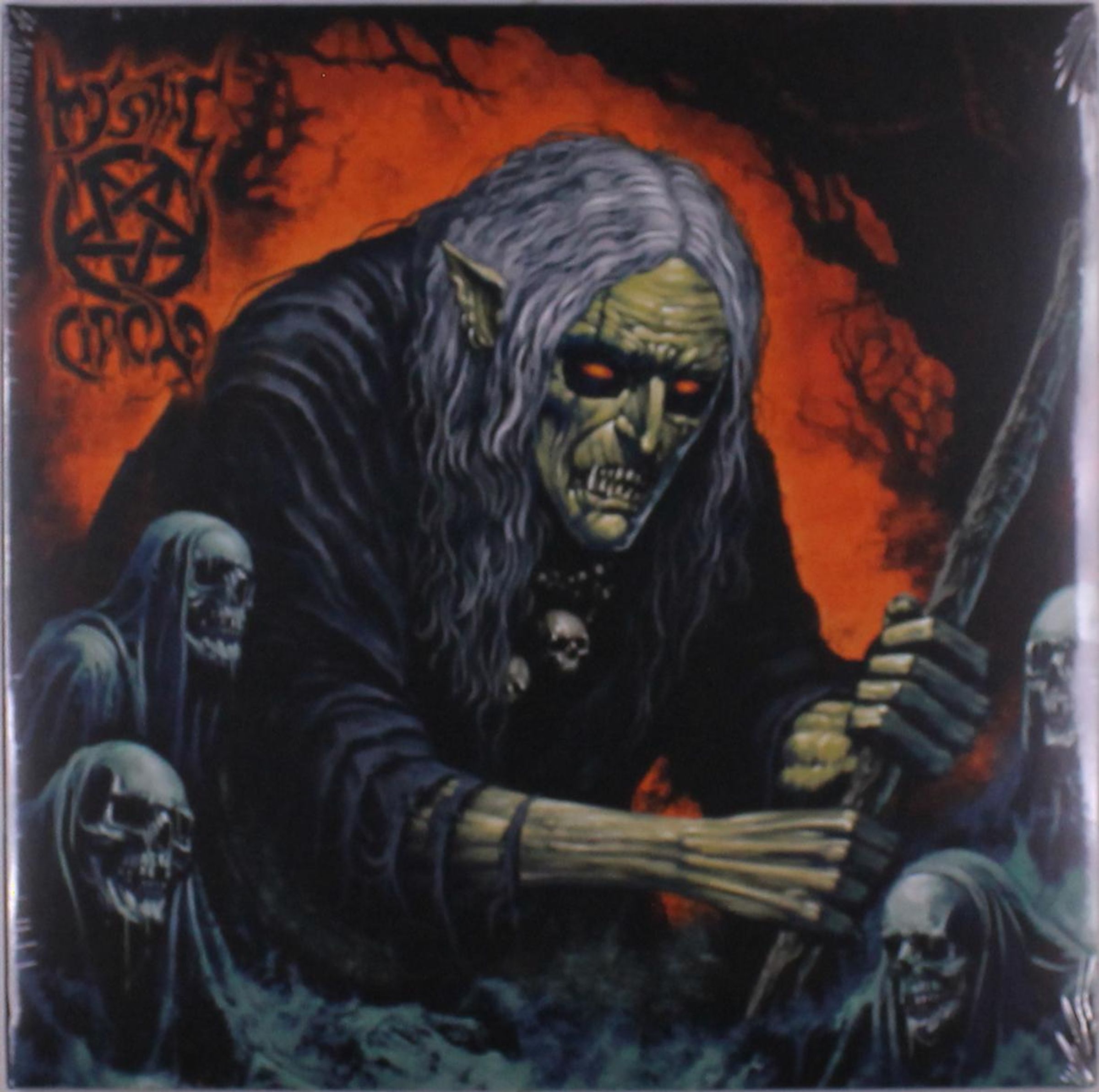 Mystic Circle: Eine unheimliche Figur mit spitzen Ohren, leuchtend roten Augen, umgeben von Schädeln und Kapuzenwesen., LP
