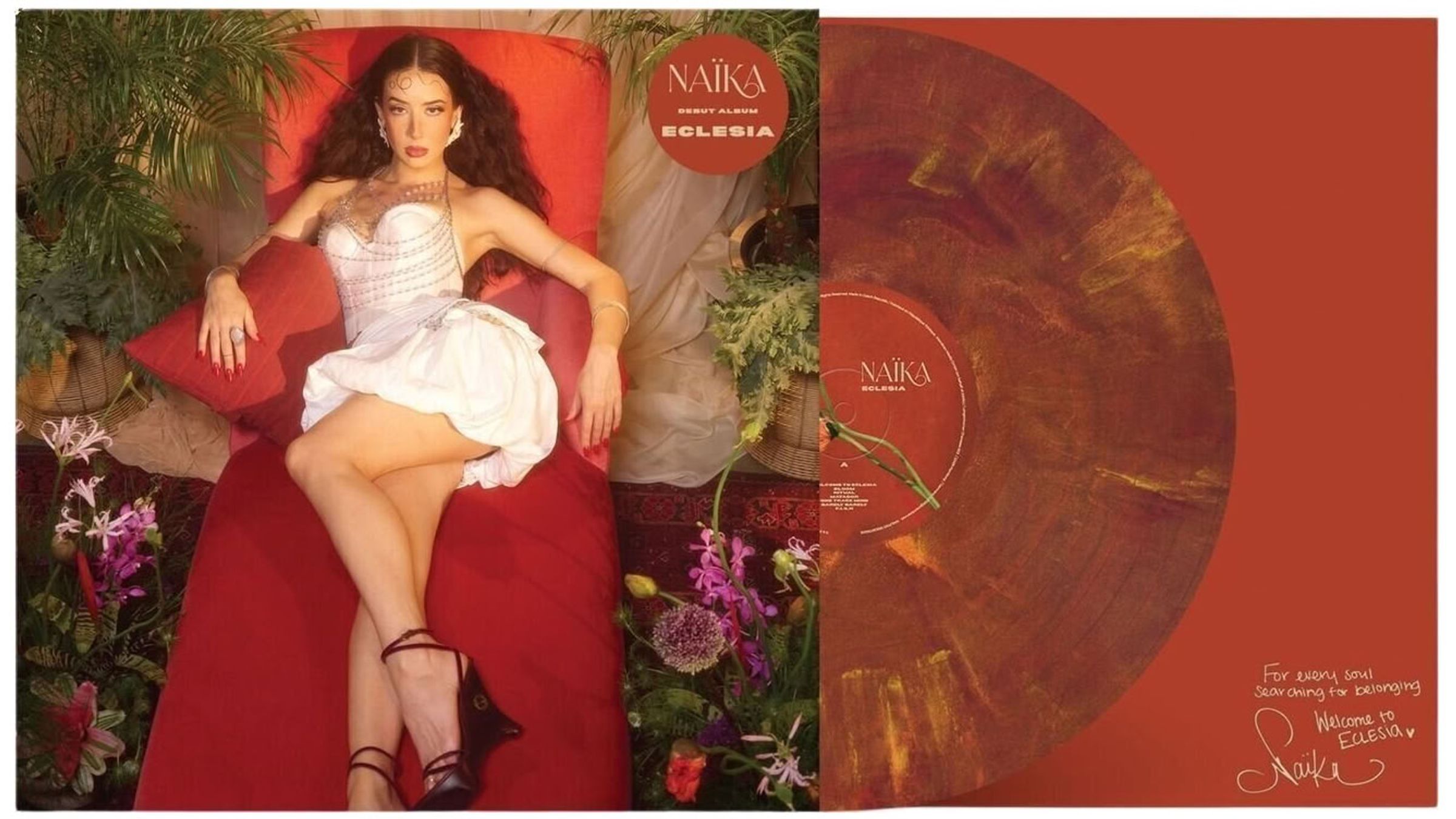 "NAÏKA DEBUT ALBUM ECLESIA" ist in Großbuchstaben auf einem rot-braunen Hintergrund. Eine Frau liegt in einem weißen Kleid auf einem roten Sofa, umgeben von Pflanzen., LP