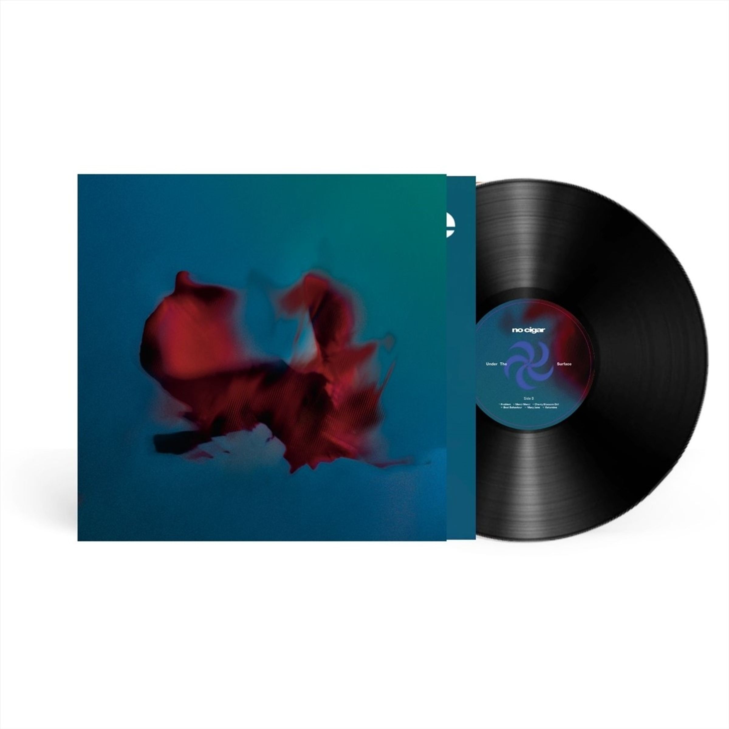 Der Text auf der Schallplatte lautet: "no cigar, Under These, Bar Lies". Links zeigt eine blau-rote abstrakte Kunst., LP