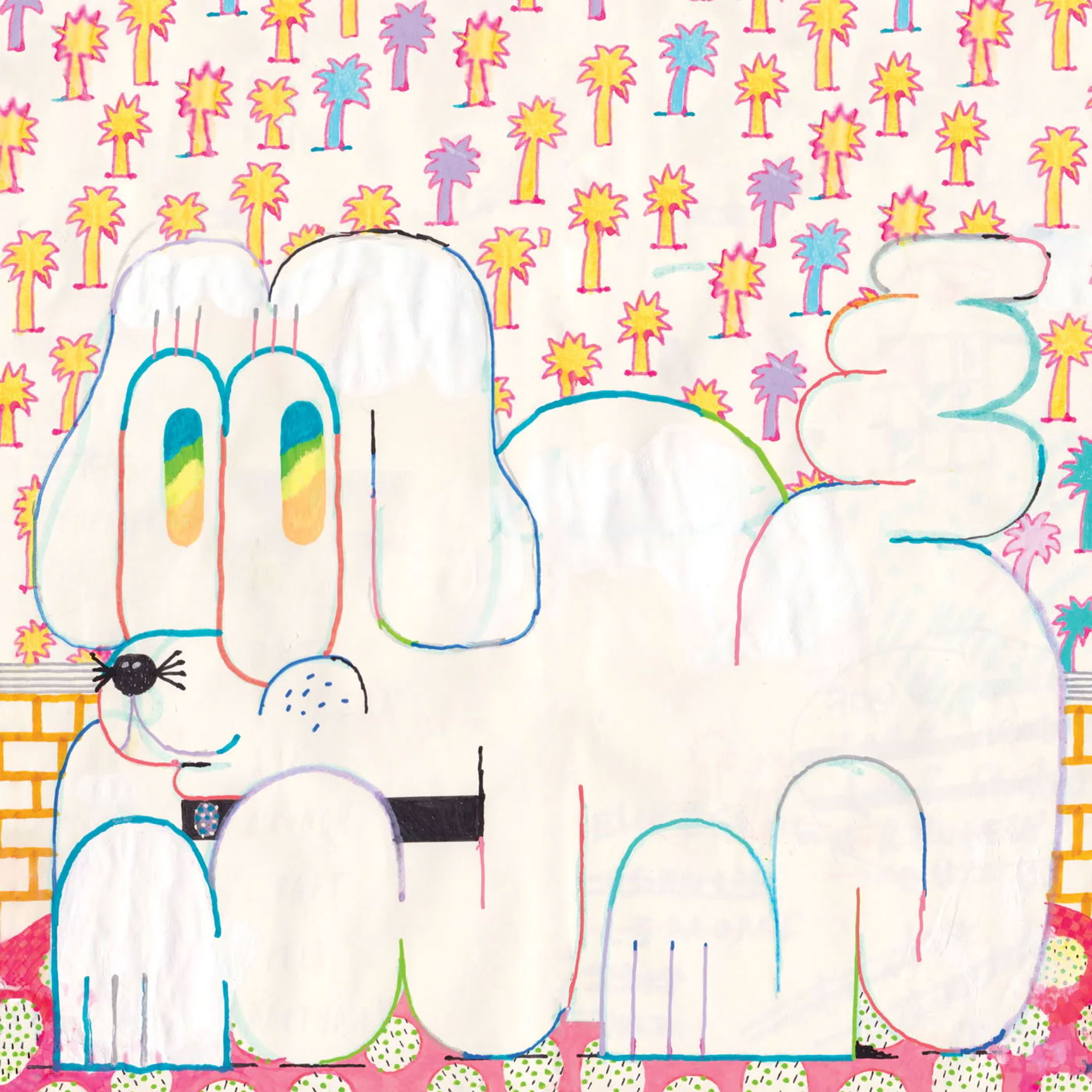 Illustration: Ein cartoonartiger, bunter Pudel vor einer hellen Kulisse mit pink-gelben Palmen., LP