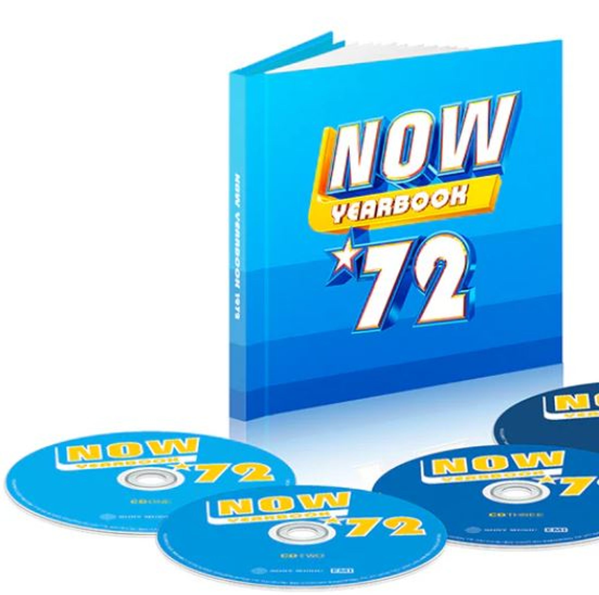 „NOW Yearbook 72“ steht auf einem blauen Buch und CDs. Buch mit Sternenmotiv., 4 CDs