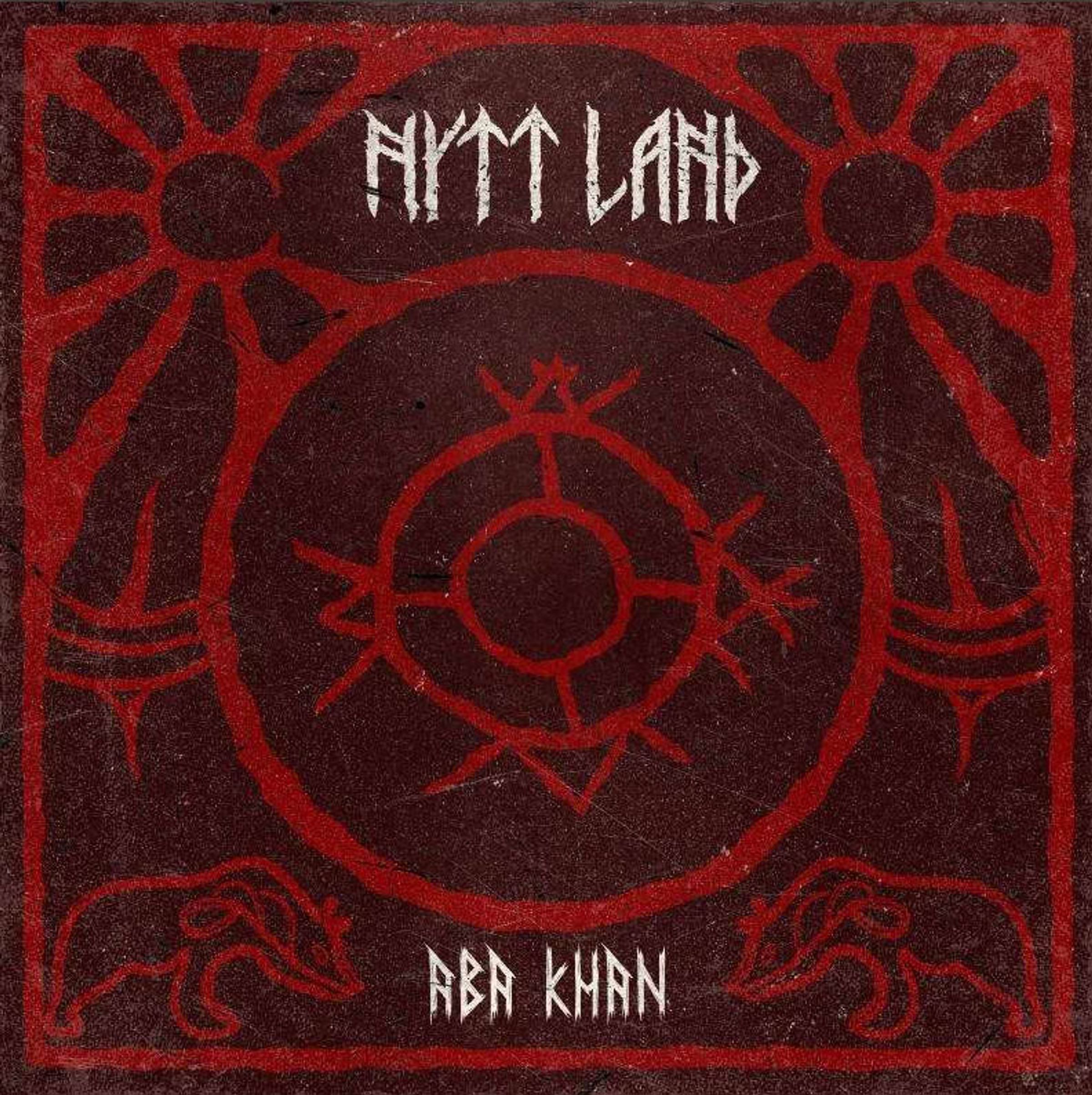 Oben steht "NYTT LAND", unten "ABA KHAN". Rote Symbole, Kreis in der Mitte, Sonnenformen und Tierumrisse auf dunklem Hintergrund., LP