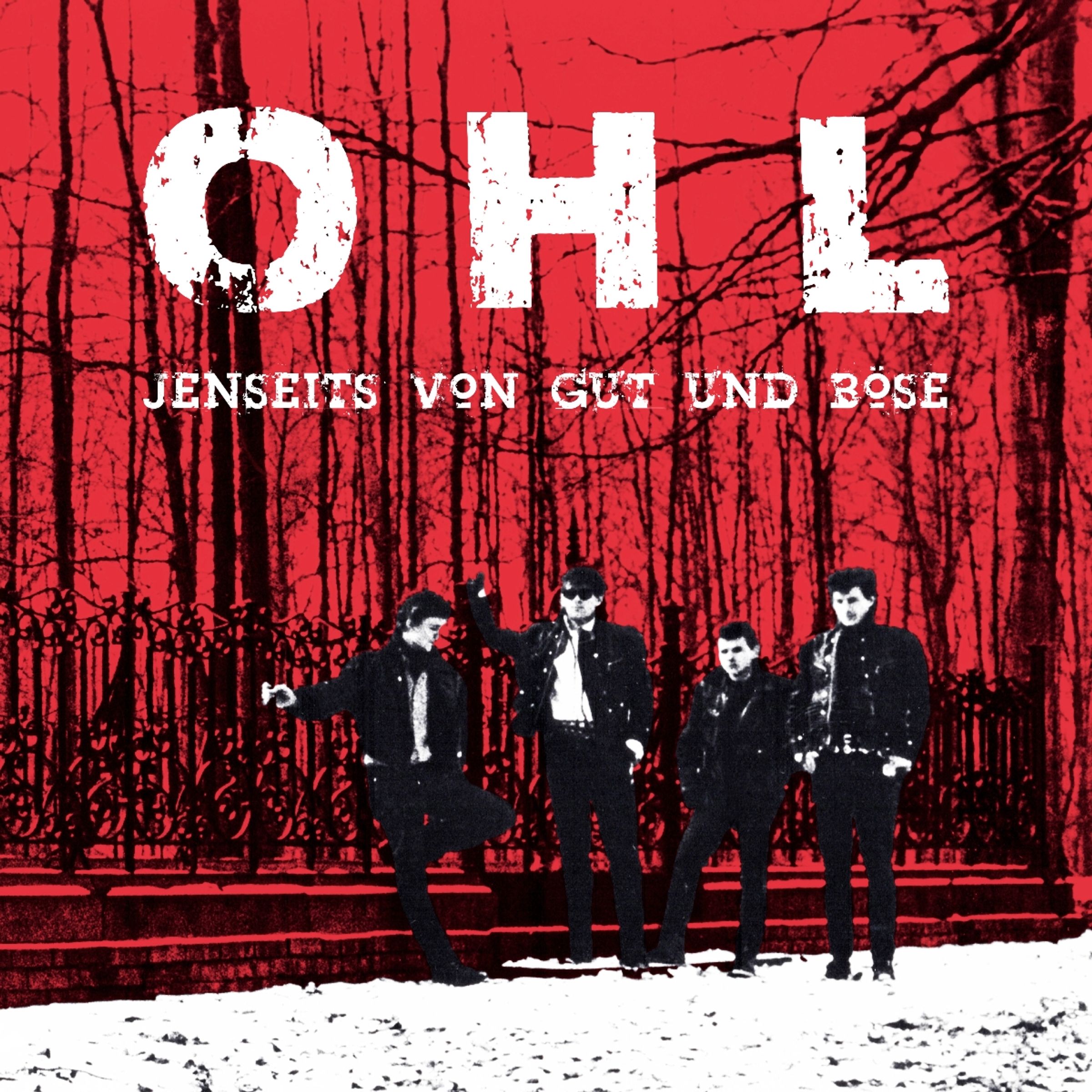 „JENSEITS VON GUT UND BÖSE“ steht unter „OHL“. Vier Personen vor einem Hintergrund mit Bäumen und Zaun., LP