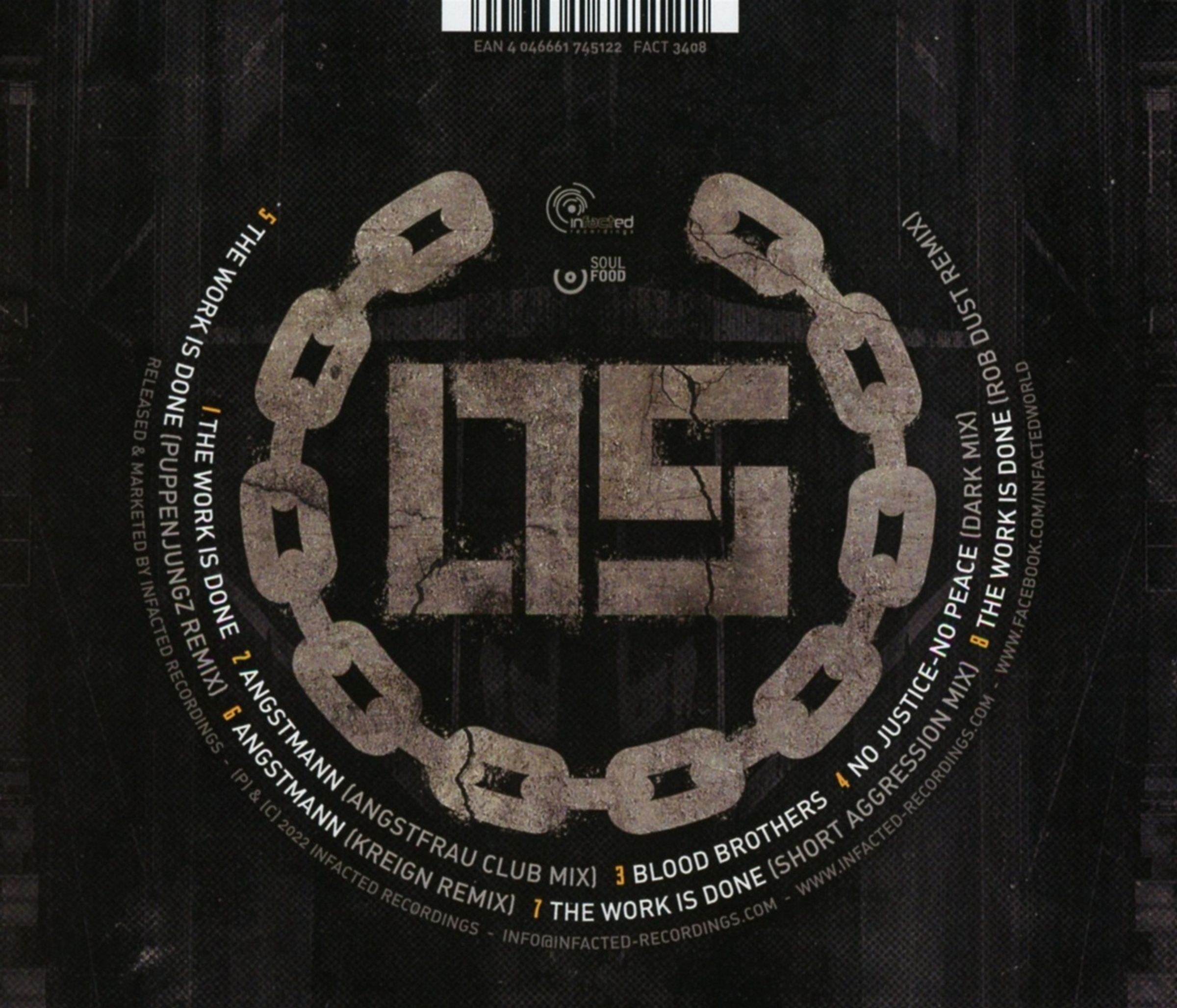 Neben dem Titelsong "The Work Is Done" findet sich der non-Album Titel "Blood Brothers", zwei Remixe der letzten digitalen Single "Angstmann" und ein "Dark Mix" des Album Titels "No Justice - No Peace" auf der CD. Doch damit noch nicht genug. Das mysteriöse Projekt "Puppenjungz" sowie "Orange Sector" selbst steuern Remixe bei, bevor ein wieder einmal großartiger "Rob Dust Remix" den Release abrundet.