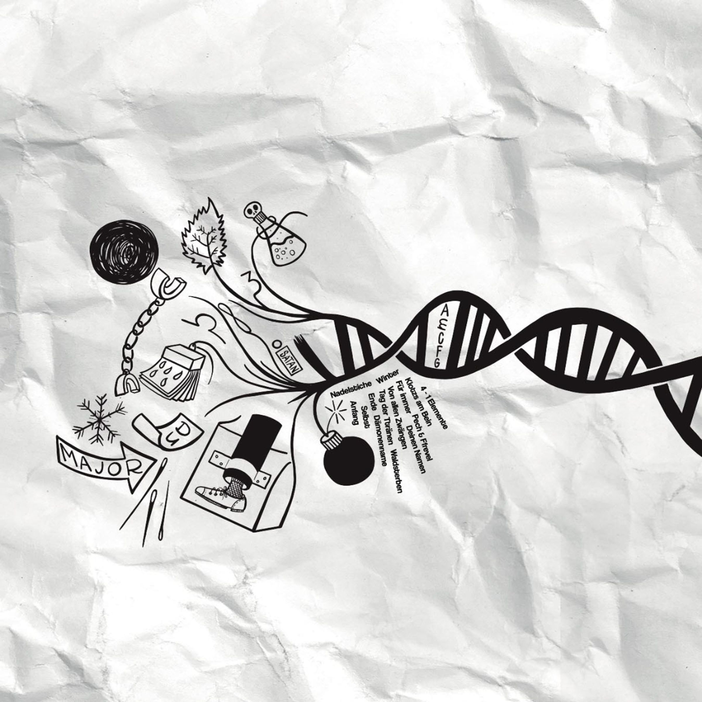 Text „PANIKRAUM Selbst“. Illustration einer DNA-Helix auf zerknittertem Hintergrund., LP