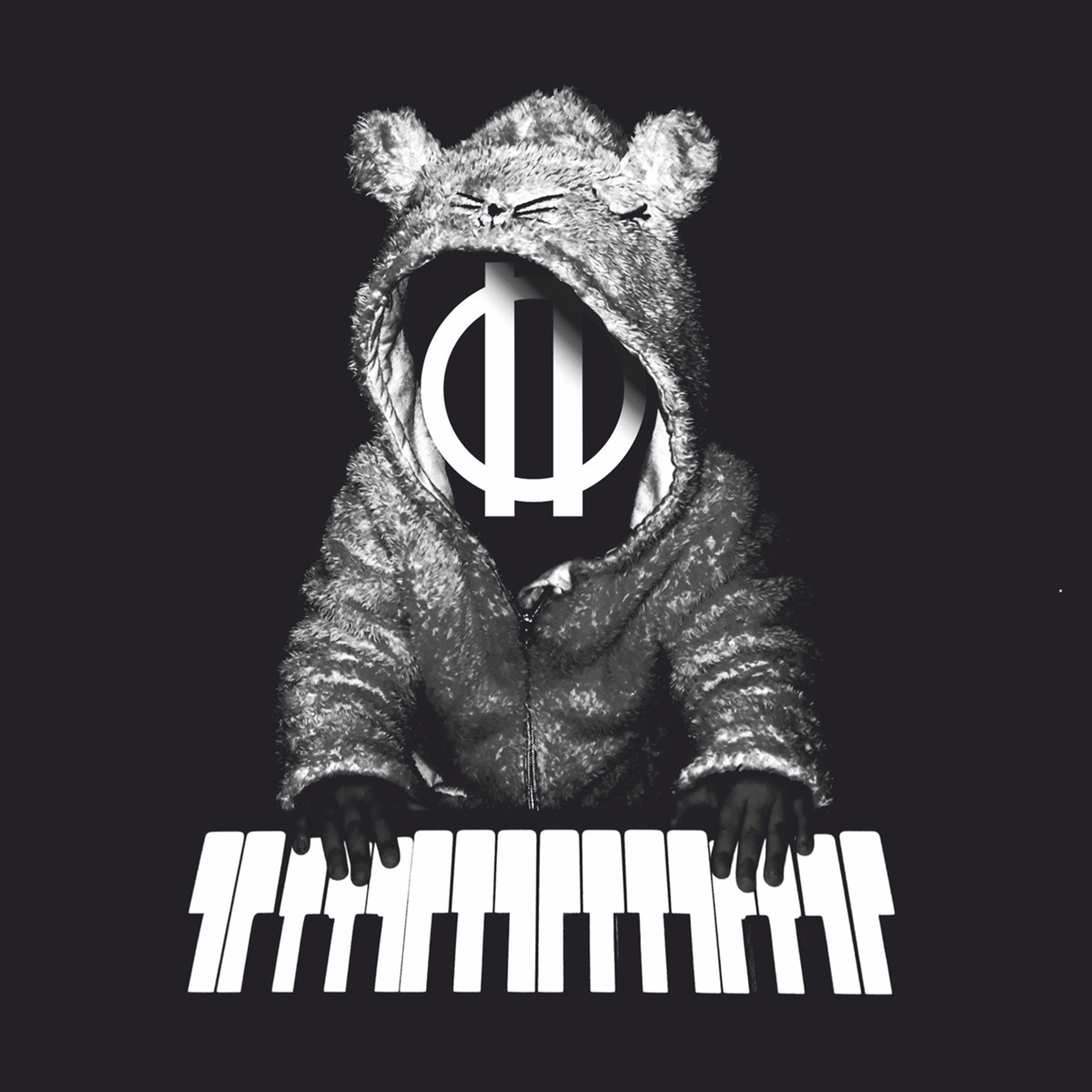 Text: Ein großes stilisiertes W-Symbol. Illustration: Eine Person in einem flauschigen Bärenkostüm spielt ein abstraktes Klavier., CD