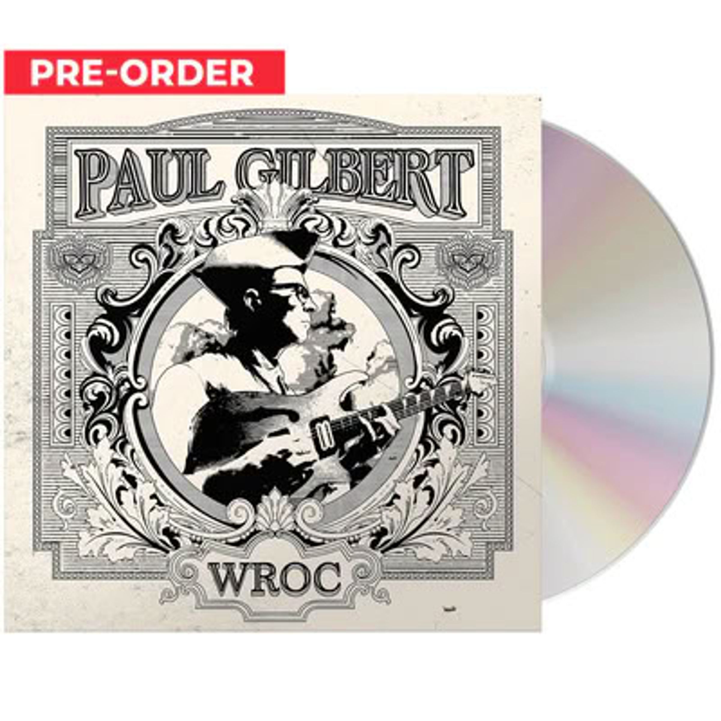 Text: "PRE-ORDER", "PAUL GILBERT", "WROC". Schwarz-weiße Illustration eines Gitarristen in einem dekorativen Rahmen, daneben CD., CD