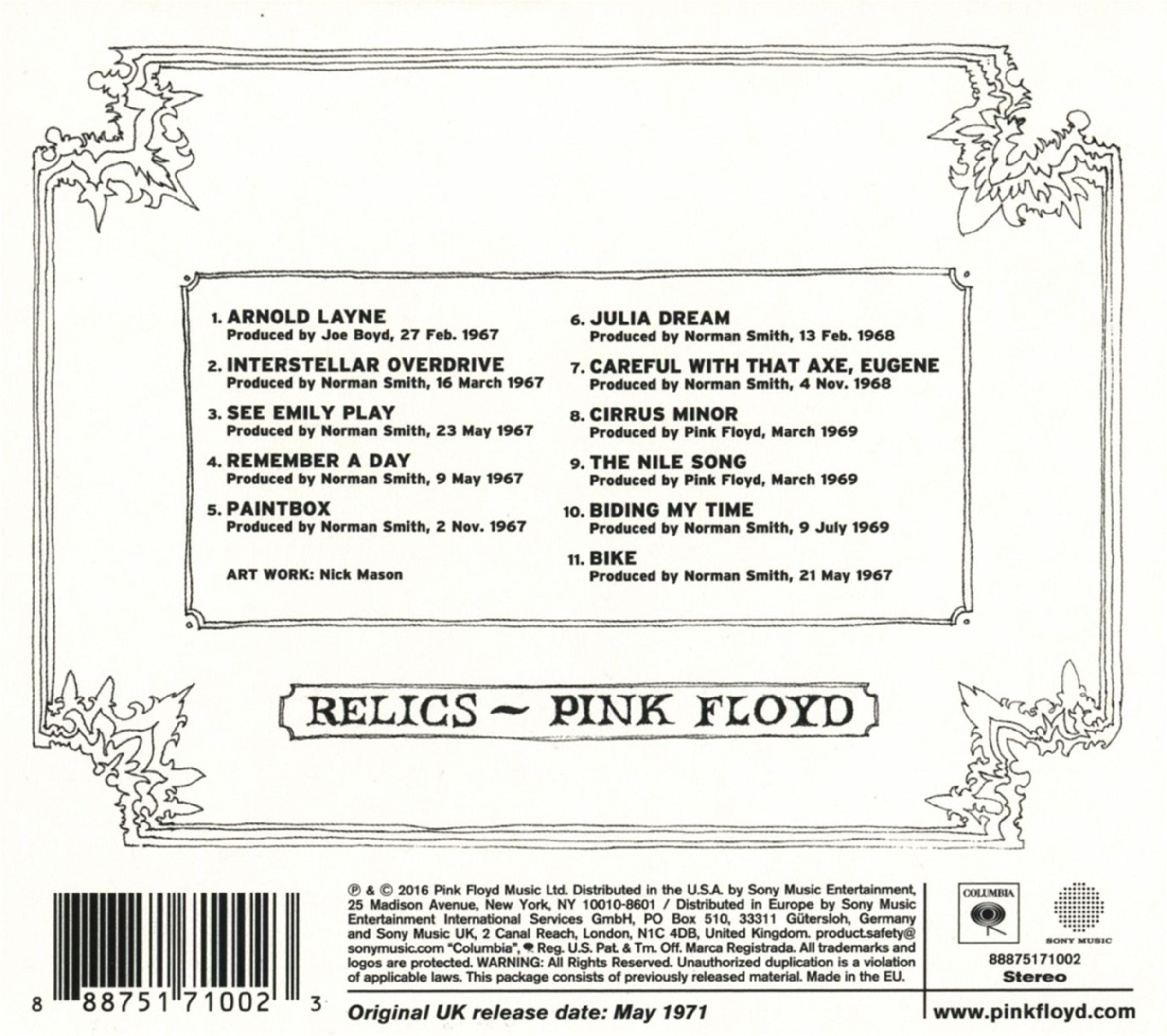 »Relics« ist das erste Compilation-Album von Pink Floyd und enthält Singles, B-Seiten und Tracks ihrer ersten drei Alben; »The Piper At The Gates Of Dawn«, »A Saucerful of Secrets« und weitere. Enthält das damals noch unveröffentlichte »Biding My Time«, Mono Mixes der Singles »Arnold Layne« und »See Emily Play«, und die Originalaufnahme von »Careful with That Axe, Eugene«.