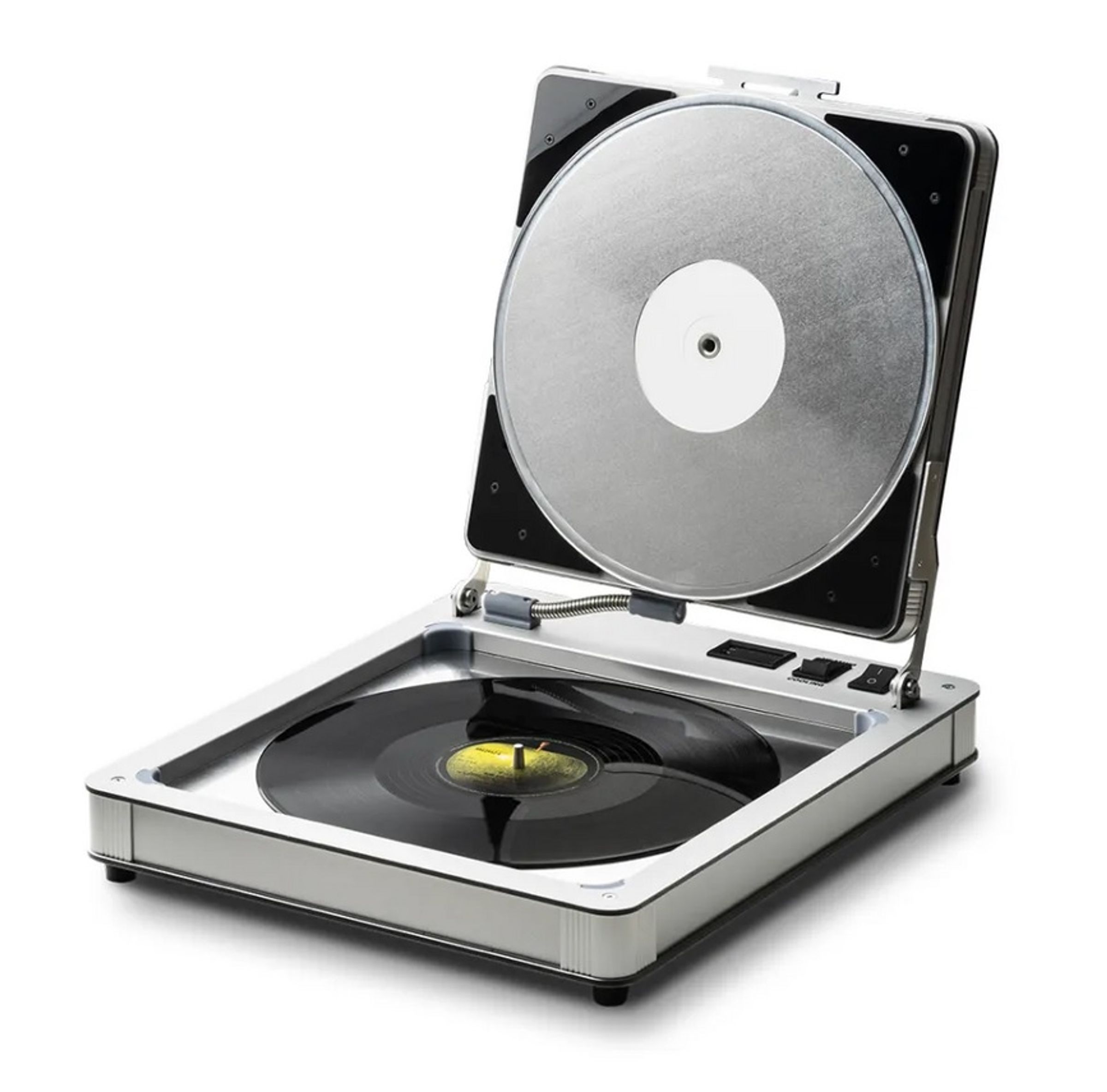 Ein silberner Plattenspieler mit offenem Deckel und einer schwarzen Schallplatte., Zubehör