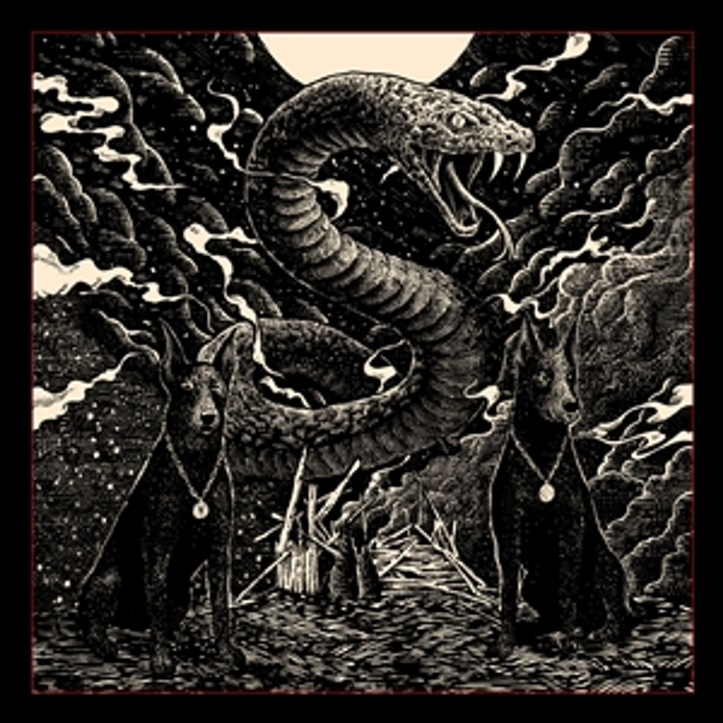 Eine Vinyl-Schallplatte mit einem Cover, das eine Schlangenskulptur vor einem düsteren, wolkigen Himmel zeigt., LP